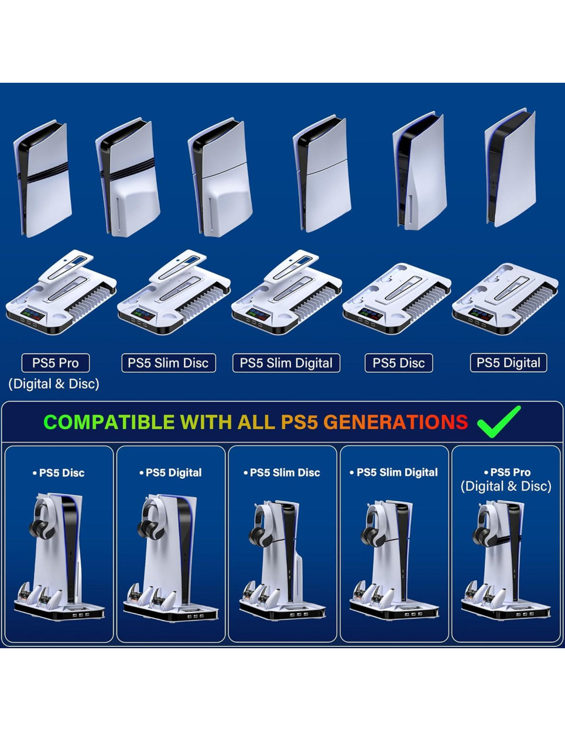 - Base Multifuncional para PS5 & Espacio Seguro: La estación de enfriamiento ps5 puede organizar bien los accesorios del controlador ps5, auriculares inalámbricos, control remoto de medios, tornillo y 13 discos de juegos ps5 en un solo lugar, ahorrando espacio y manteniendo tu área de juego ordenada y limpia mientras mantiene la configuración de PS5 fresca y con un mejor aspecto, facilitando el acceso a tus accesorios ps5 cuando los necesites. La estación de ventilador de enfriamiento ps5 pro es un mejor reemplazo para la estación de carga oficial PS5 y el soporte base horizontal.