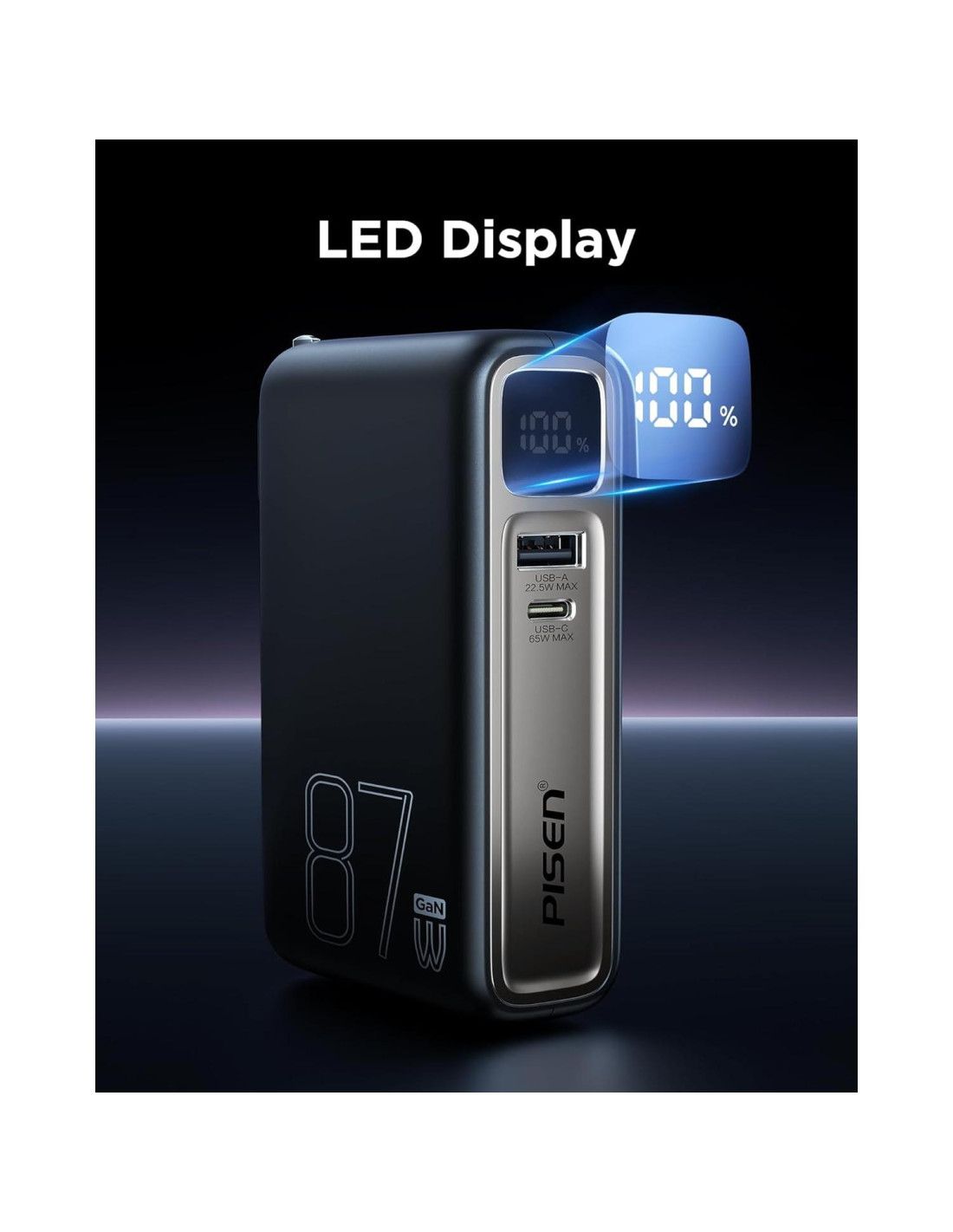 - [Cargar 2 Dispositivos Simultáneamente]: Como cargador, el puerto USB C del cargador híbrido 2-en-1 PISEN tiene una potencia máxima de 65W. Al cargar dos dispositivos al mismo tiempo, la distribución de potencia es de 65W+22.5W (Total 87W). Monitorea tu nivel de batería y tiempo de uso sin esfuerzo con la pantalla LCD de batería en tiempo real del power bank portátil PISEN.