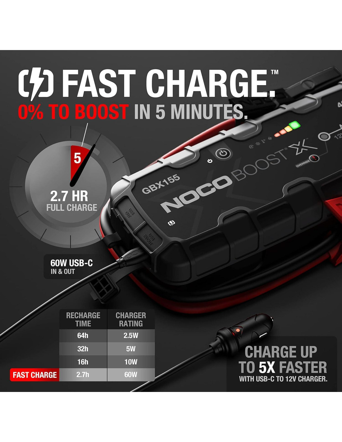 NOCO Boost X GBX155 es un arrancador de batería de litio portátil para baterías de 12 voltios en vehículos con motores de gasolina de hasta 10,0 litros y diésel de 8,0 litros, incluidos automóviles, motocicletas, camiones, vehículos todo terreno, embarcaciones, vehículos recreativos, furgonetas, vehículos utilitarios deportivos, tractores y más. Este diseño completamente nuevo para una potencia de arranque extrema y con una clasificación de 4250 amperios libera la máxima energía en cada arranque. Viene equipado con tecnología USB-C Power Delivery de 60 W para una recarga ultrarrápida (pasa de 0 % a arranque rápido en 5 minutos de carga) y alimenta tus dispositivos USB-C favoritos como teléfonos, tabletas, computadoras portátiles, dispositivos portátiles y más. Incluye nuestra tecnología de seguridad avanzada, UltraSafe 2.0, con protección a prueba de chispas y de polaridad inversa, pero con eficiencia térmica mejorada y administración de energía para brindar un mejor rendimiento y una mayor duración de la batería. Esto es lo que obtienes con el nuevo Boost X: paquete de arranque auxiliar de batería de litio portátil ultraseguro para automóvil GBX155, banco de energía con suministro de energía USB-C de 60 W, abrazaderas de cable de puente de servicio pesado, cable de carga USB-C, cargador rápido USB-C de 12 V, bolsa de almacenamiento de microfibra, garantía de 1 año y diseñado en los EE. UU.