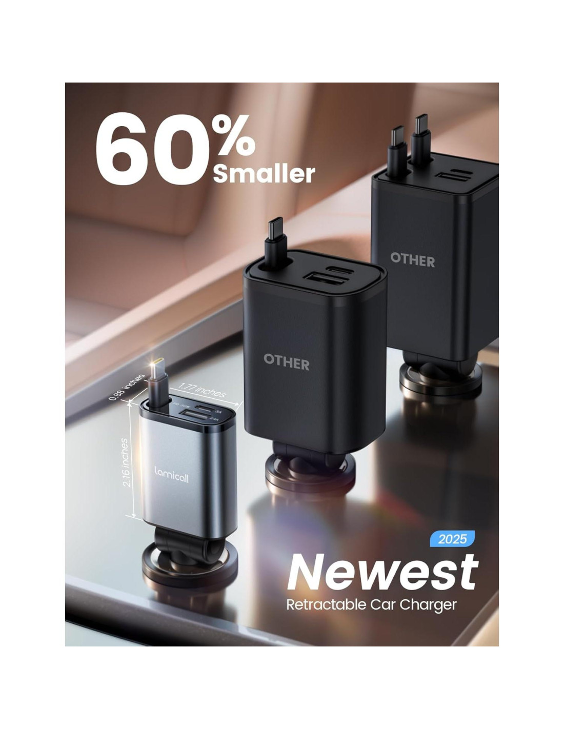 - Múltiples puertos de carga: además del cable USB-C retráctil incorporado, este cargador de coche rápido incluye puertos USB-A y USB-C adicionales, permitiendo a los usuarios cargar hasta tres dispositivos simultáneamente, siendo una opción ideal para viajes familiares o en grupo.