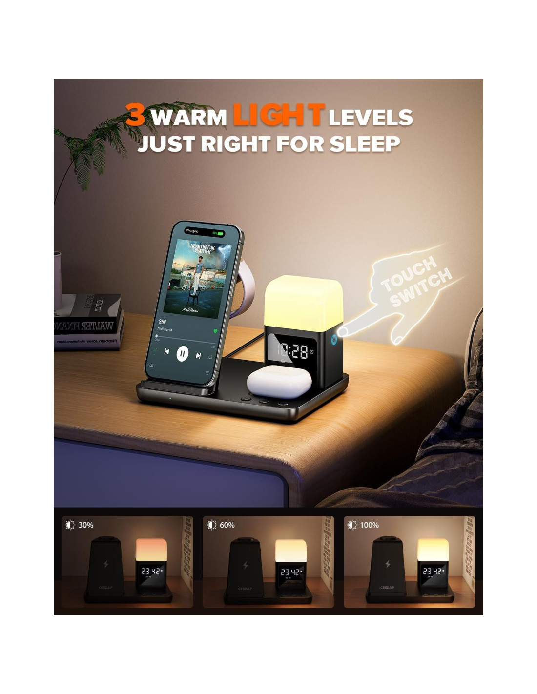 - [Luz Nocturna Suave] La luz nocturna integrada ofrece un suave resplandor cálido, ideal para iluminar tu habitación por la noche. Con múltiples niveles de brillo, puedes crear la atmósfera perfecta. La luz nocturna LED ajustable ofrece tres niveles de brillo, proporcionando un suave resplandor para tu mesita de noche. Perfecto para leer, amamantar o simplemente añadir un ambiente acogedor a tu habitación.