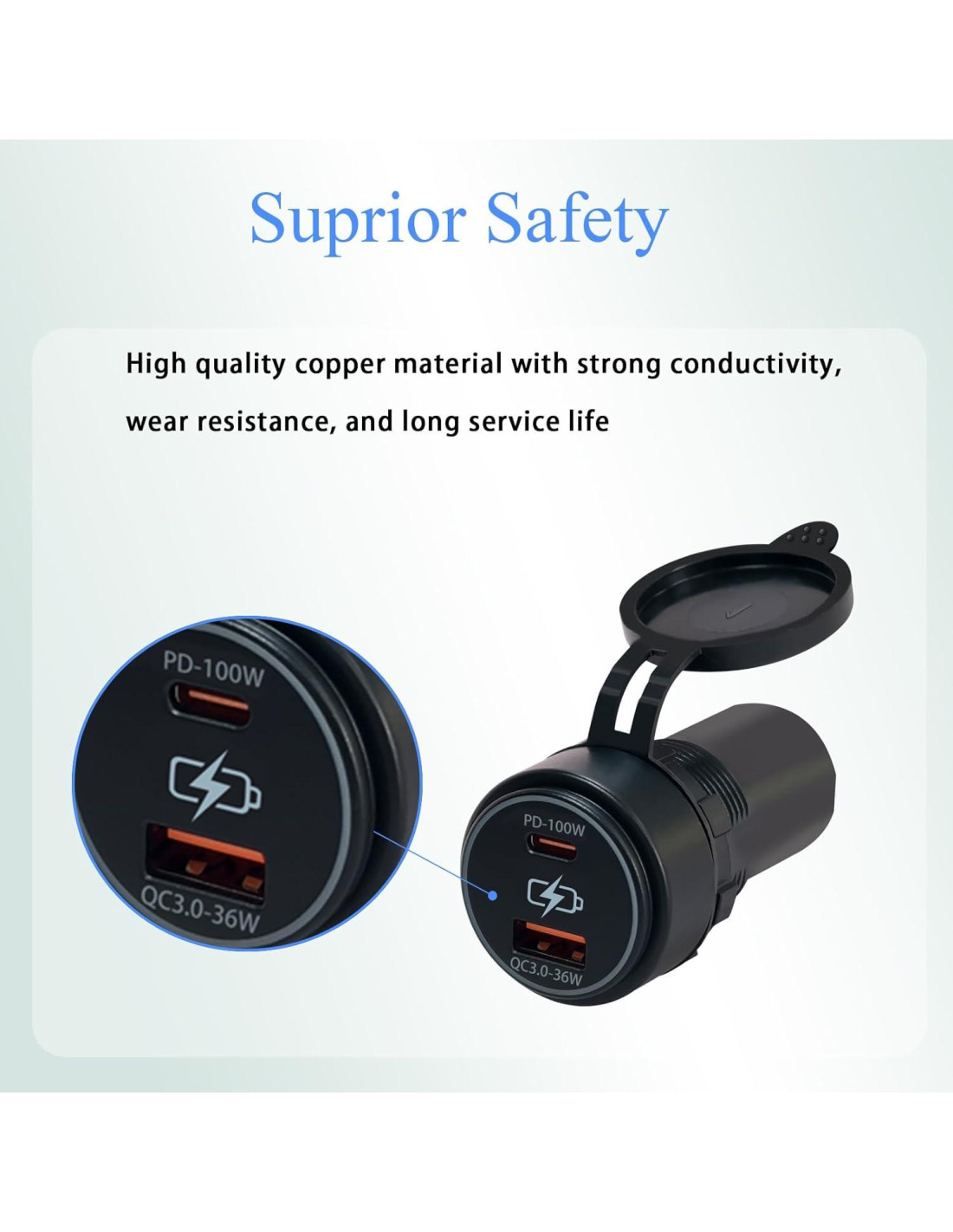 - Diseño seguro: El diseño de circuito inteligente protege contra sobrecorriente, sobrecarga, sobrecalentamiento y cortocircuito. La clasificación de impermeabilidad IP66 con tapa de goma a prueba de polvo protege el dispositivo de la humedad y el polvo. La carcasa de plástico ABS de alta calidad asegura durabilidad y resistencia al calor (-25C a 80C). La luz indicadora de potencia azul muestra claramente el estado de operación.