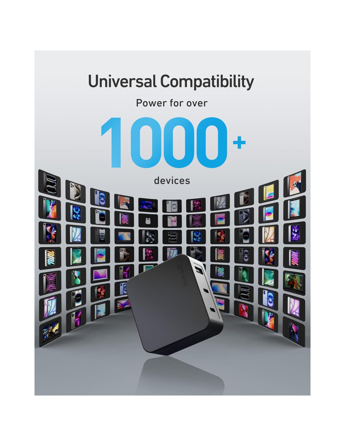 - Diseño ultra delgado: Presenta tecnología GaN II para un diseño más compacto. Perfecto para espacios reducidos detrás de camas, sofás y otros muebles, ahorrando espacio