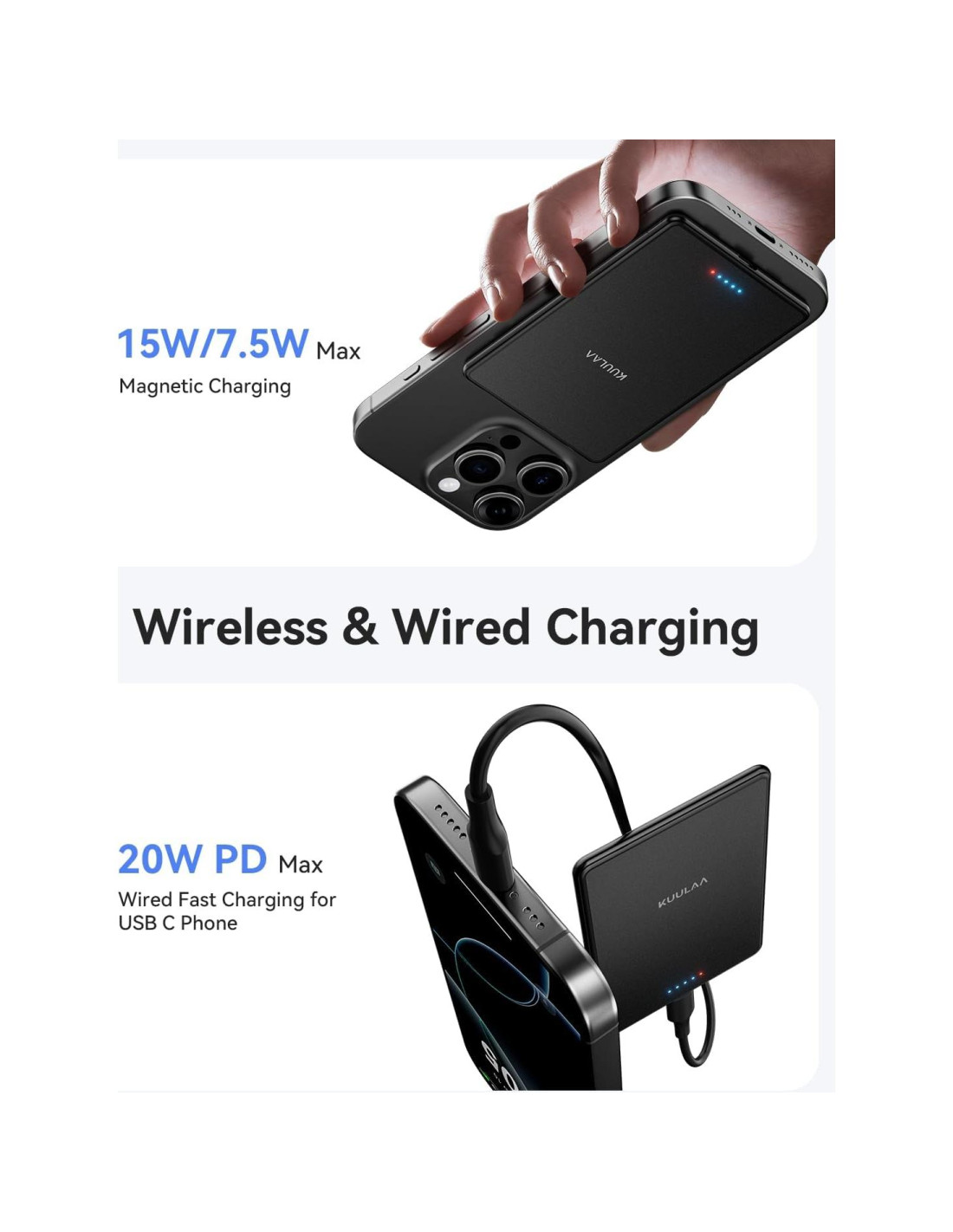 - Perfil Ultra Delgado de 0.27" - Aprovechando la última tecnología de celdas, este delgado power bank inalámbrico se adapta perfectamente a tus bolsillos o bolsas, proporcionando una solución de carga discreta y eficiente sin comprometer la potencia o el rendimiento. Nuestro cargador portátil magsafe más delgado (solo 0.27 pulgadas o 0.68 cm de grosor) se adapta discretamente en tu bolsillo o bolsa pequeña, perfecto para viajeros y minimalistas que necesitan energía sin volumen.