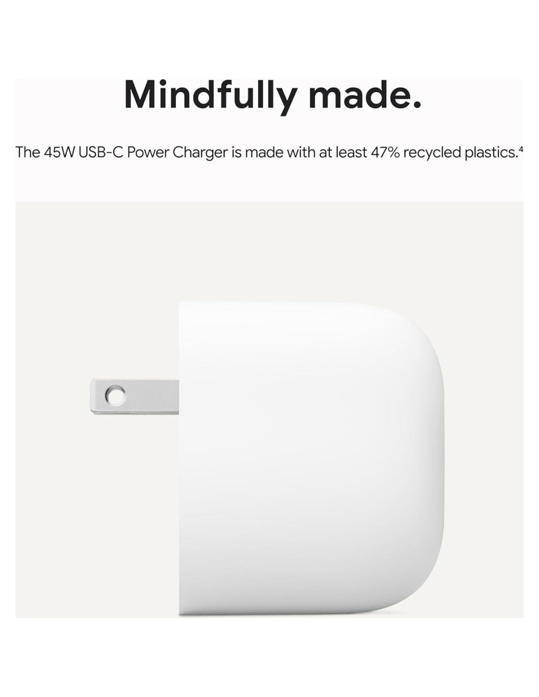 - El cargador de poder USB-C de 45W de Google está fabricado de manera consciente con un 47% de plásticos reciclados