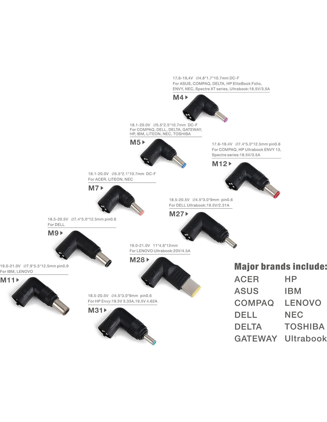 - Alta compatibilidad: 9 puntas de salida DC intercambiables controladas para soportar la mayoría de las marcas: ACER, ASUS, COMPAQ, DELL, DELTA, GATEWAY, HP, IBM, LENOVO, NEC, TOSHIBA, Ultrabook.
