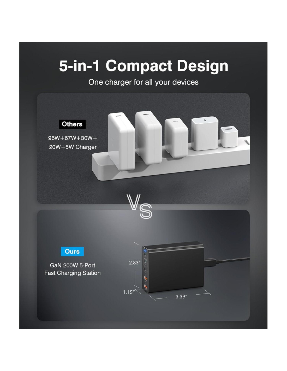 - Lo Que Obtienes: 1 x Bloque de Carga USB-C de 5 Puertos, 1x Cable de Extensión AC Desmontable de 5FT.