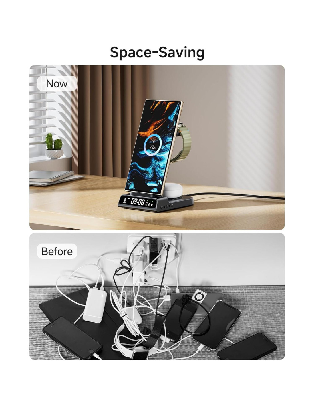 - Limpia Tu Escritorio Desordenado: ¿Cansado de lidiar con cables desordenados y desorden en tu mesita de noche o escritorio? Nuestra estación de carga inalámbrica es adecuada para el hogar, la oficina y los viajes. Esta estación de carga inalámbrica ayuda a simplificar tu escritorio y mesita de noche