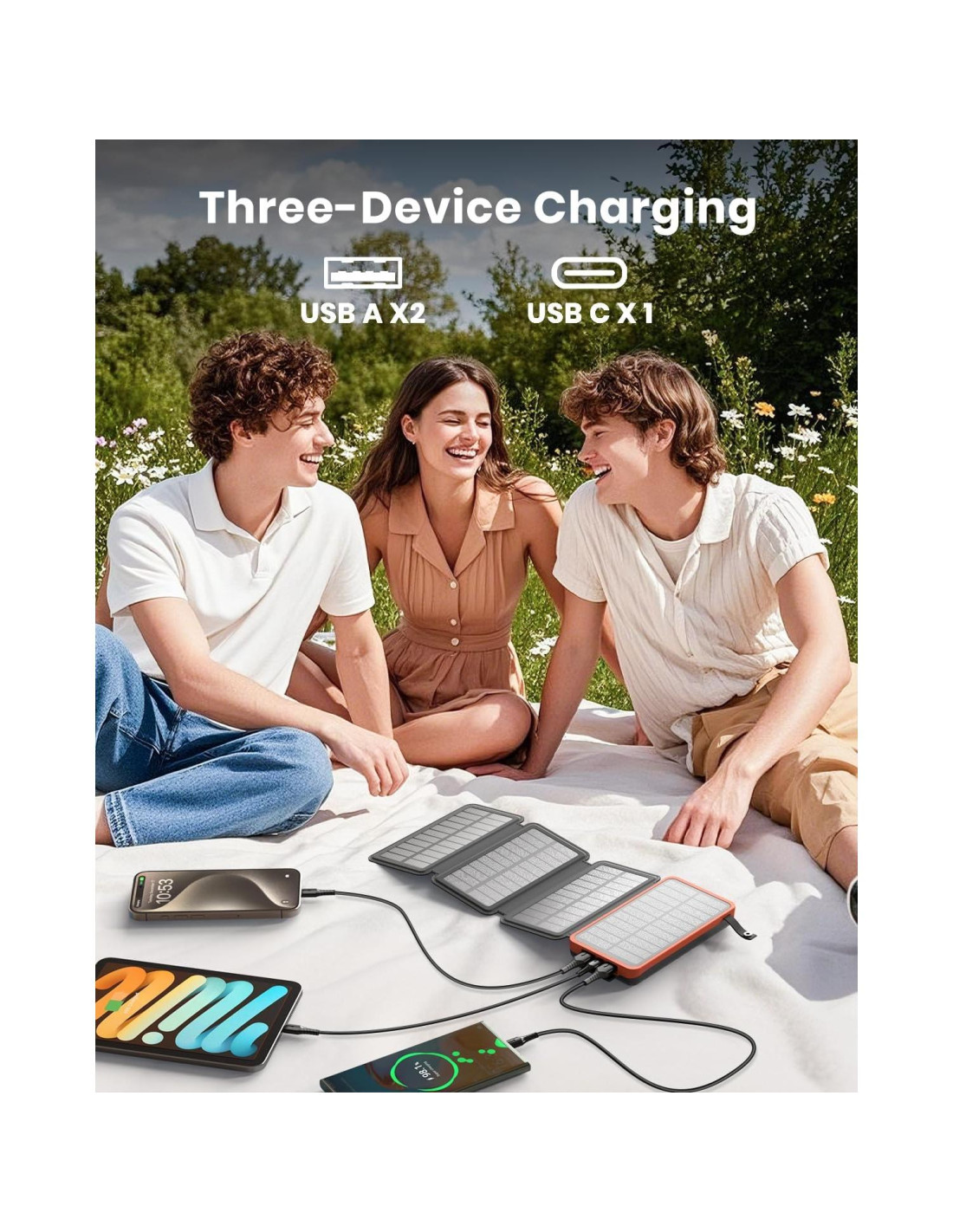 - Carga Súper Rápida: Con la tecnología mejorada QC 3.0, este banco de poder solar ofrece carga rápida a 5V/3A, alcanzando el 65% de batería en solo 30 minutos. Cuenta con un puerto USB-C y dos puertos USB-A, permitiendo la carga simultánea de tres dispositivos.