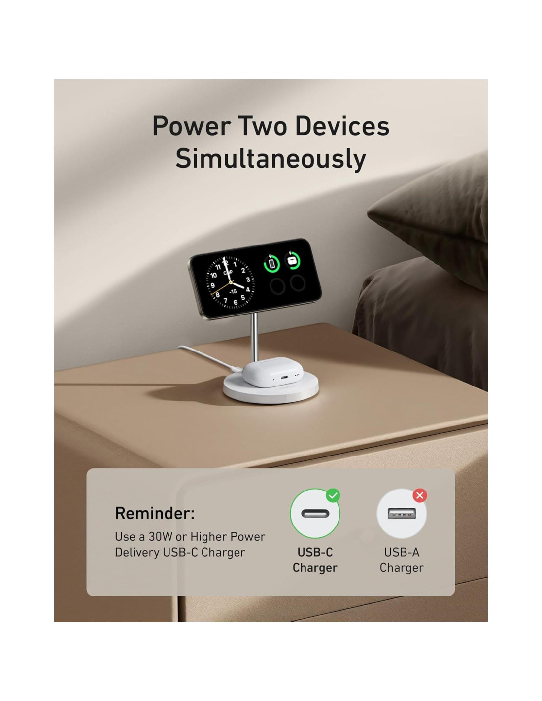 - Carga 2 Dispositivos a la Vez: Disfruta de la conveniencia y los beneficios de ahorro de tiempo al cargar tanto tu teléfono como tus auriculares al mismo tiempo.