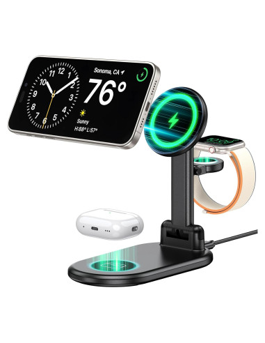 - [Carga Eficiente y Segura] : Este soporte de cargador magnético proporciona carga rápida y eficiente para sus dispositivos, equipado con características de seguridad avanzadas como protección contra sobrecarga y control de temperatura, puede dejar sus dispositivos cargando durante la noche sin preocupaciones. La estación de carga para múltiples dispositivos es compatible con Apple Watch Series Ultra 8 7 6 SE 5 4 3 (No compatible con Apple Watch 1&2), con AirPods Pro 2 3 2 (con estuche de carga inalámbrica), y el cargador inalámbrico rápido de 15W es compatible con iPhone 16/16 Plus/16 Pro/16 Pro Max/15/15 Plus/15 Pro/15 Pro Max/14/14 Plus/14 Pro/14 Pro Max/13/13 Pro/13 Pro Max/13 mini/12/12 Pro Max/12 mini