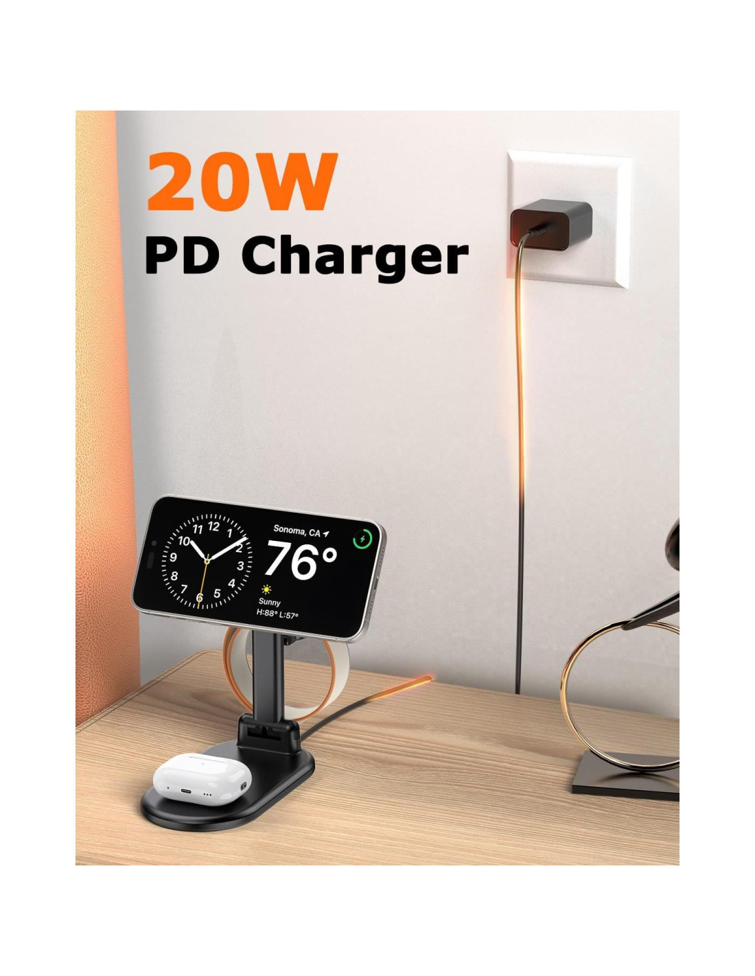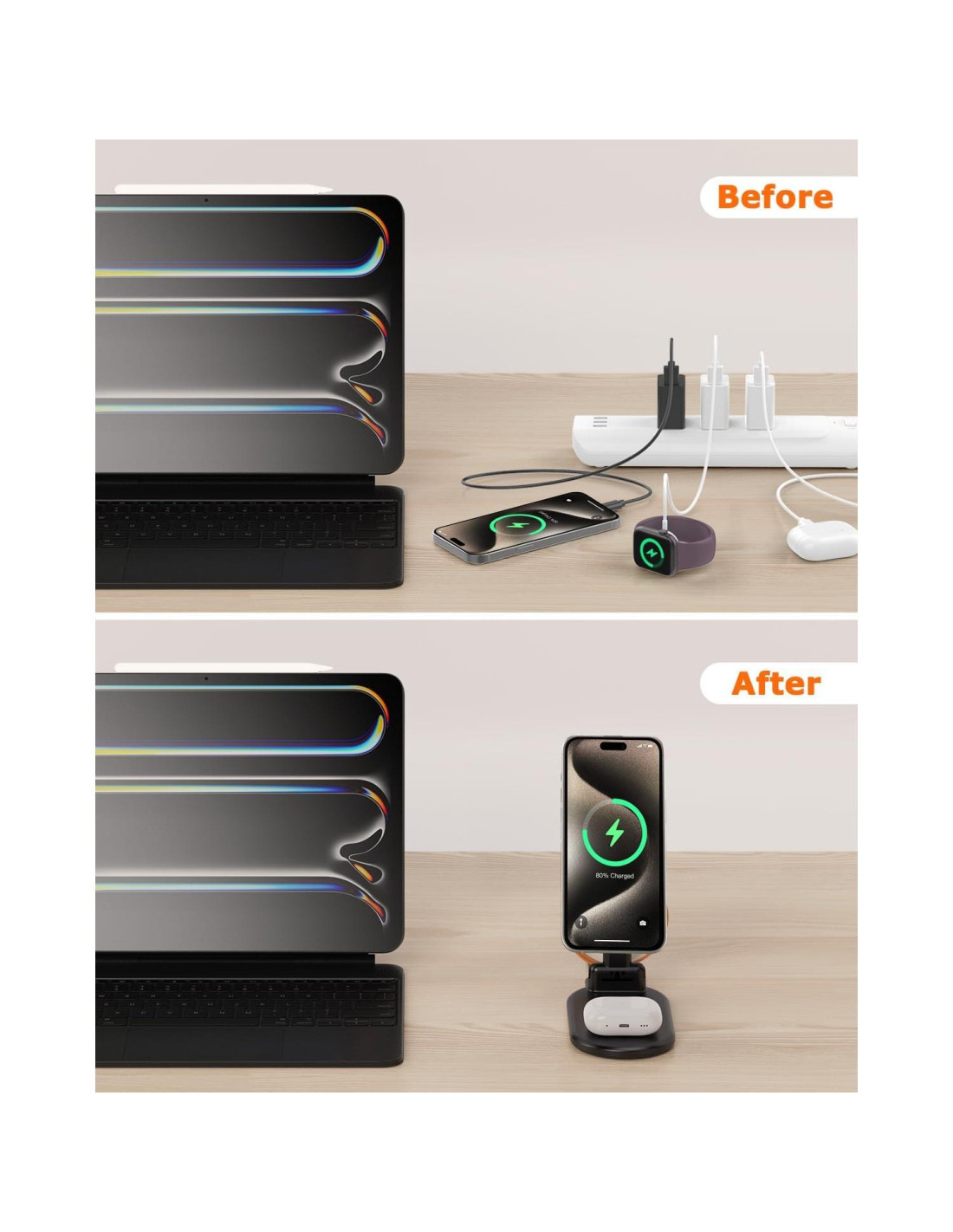- [Plegable y Portátil] : Esta estación de carga Mag Safe 3 en 1 cuenta con un diseño plegable, lo que la hace conveniente para llevar a donde quiera que vaya. Ya sea que esté viajando o trabajando, esta estación de carga se puede plegar fácilmente y guardar en su bolso o maleta, asegurando que nunca se quede sin energía sin llevar múltiples cargadores ni cables enredados.