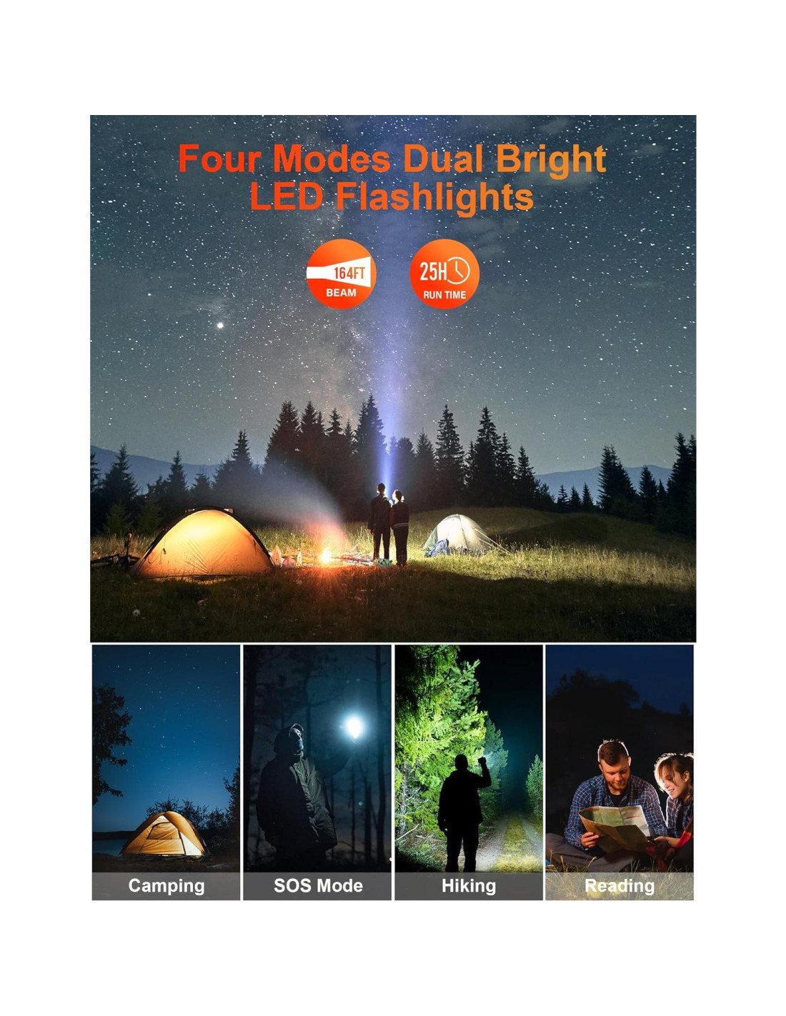 - Duales Linternas Ultra-Brillantes: El paquete de batería contiene 2 linternas LED brillantes, muy útiles para amantes del camping, la distancia de iluminación es de hasta 50 metros (165 pies) y la duración es de hasta 25 horas, estas luces juegan un gran papel durante emergencias al aire libre.