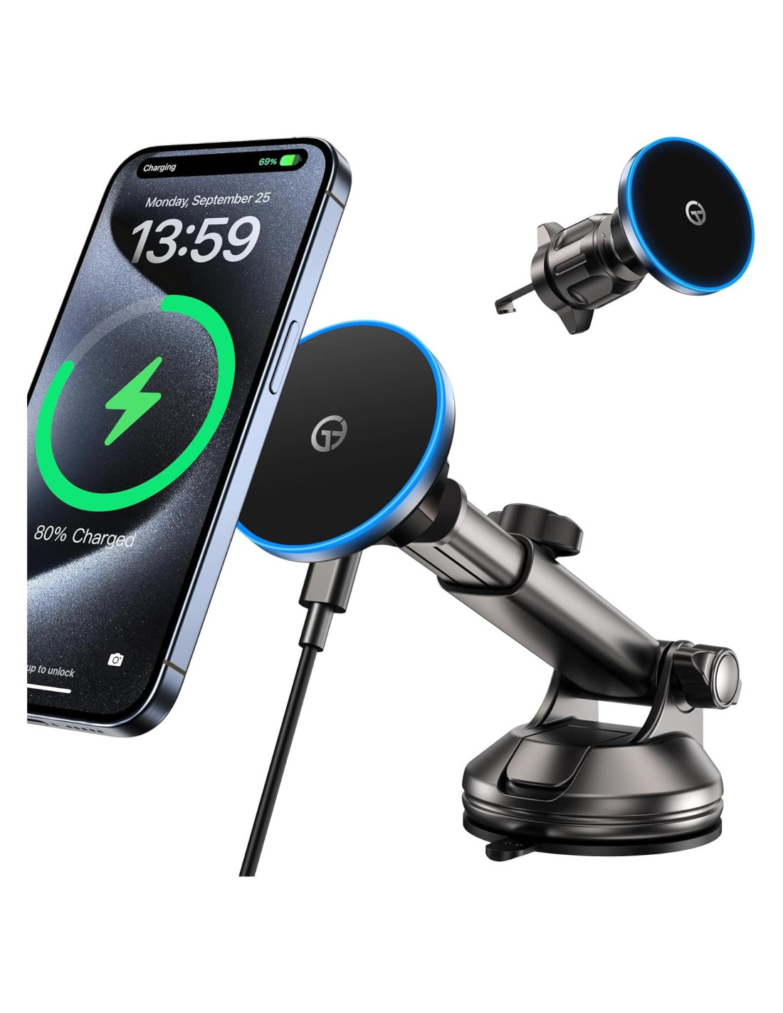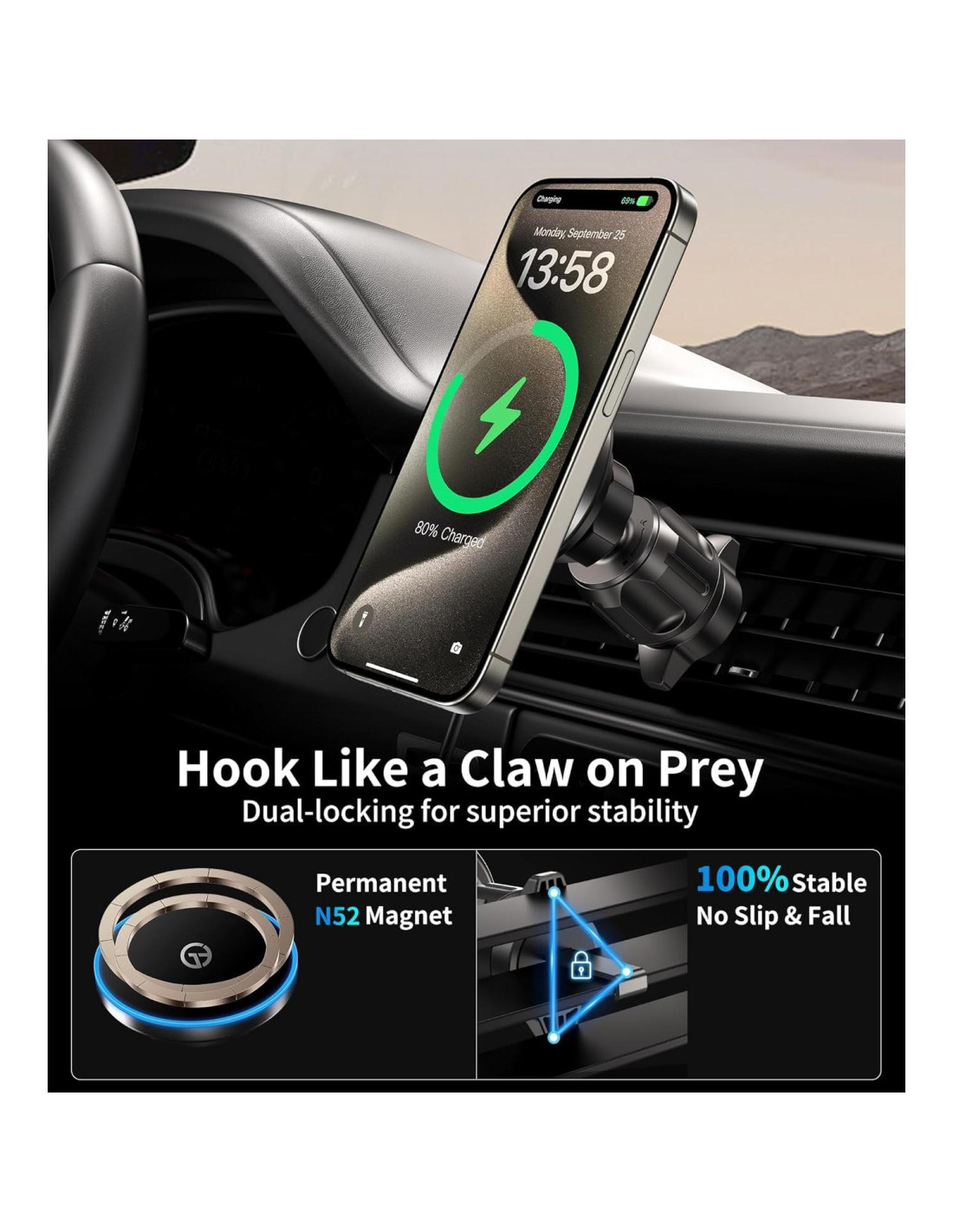 - [Eficiente para carga MagSafe] Con gestión de calor inteligente, el soporte magnético para teléfono puede lograr velocidades de carga similares a los cargadores de coche MagSafe oficiales. Se requiere un adaptador QC de 18W o más (adaptador no incluido). Nota: Las fundas magnéticas no oficiales pueden llevar a conexiones y desconexiones continuas. El porcentaje de batería puede no aumentar si el teléfono se sobrecalienta durante la navegación o el uso extensivo de aplicaciones.