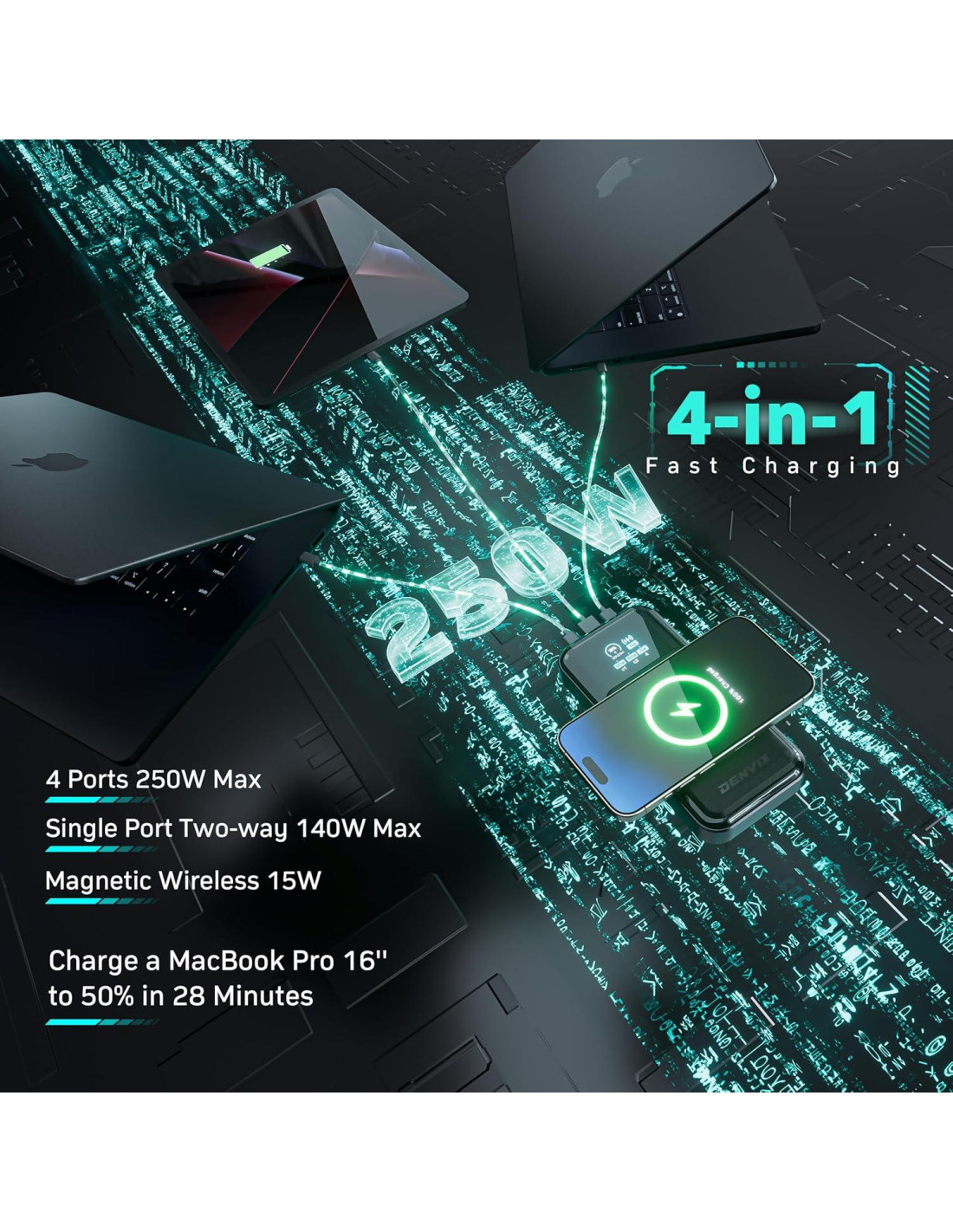- 4-en-1 Salida Total de 250W: Equipado con dos puertos USB-C bidireccionales, un puerto USB-A y un cargador inalámbrico magnético, el banco de energía entrega hasta 250W impulsado por la tecnología PD 3.1. Aumenta tu MacBook Air (M2) al 50% en solo 28 minutos. Con la mejor tecnología de disipación de calor, mantiene una salida constante de 140W por puerto sin sobrecalentarse.