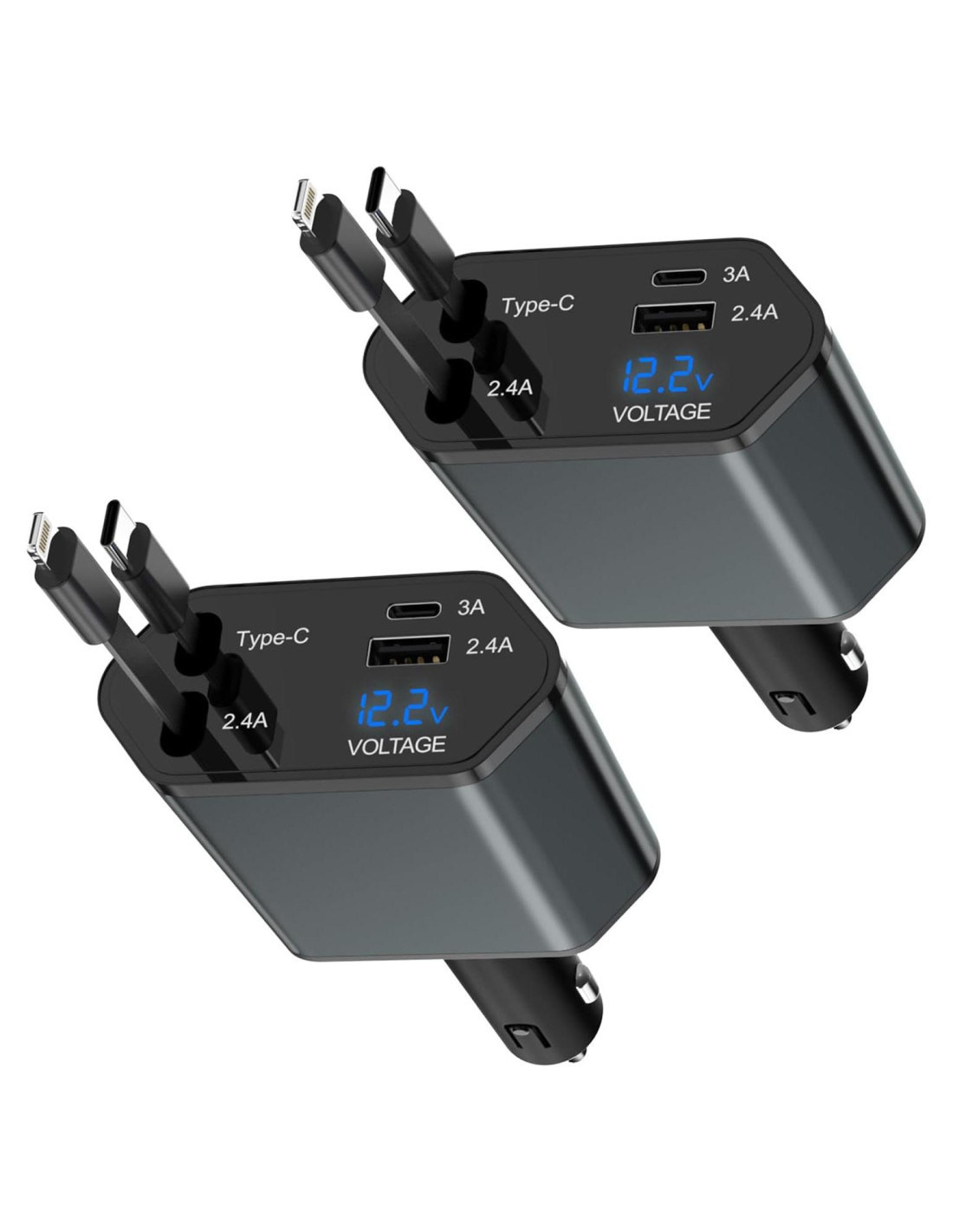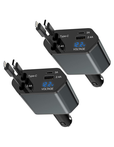 El paquete incluye: 2 paquetes de cargador de coche retráctil 4 en 1 de 66W (cable de cargador USB C + cable de cargador Lightning + puerto USB C + puerto USB A) El adaptador de cargador de coche USB 4 en 1: el cargador 4 en 1 proporciona carga rápida y versátil para múltiples dispositivos en un diseño compacto y duradero. El cargador de coche retráctil puede cargar hasta 4 dispositivos al mismo tiempo. Satisface las necesidades de carga de toda la familia, especialmente adecuado para viajar y desplazamientos diarios. Cables de carga retráctiles: viene con cables Type-C y Lightning, retráctiles hasta 80cm. Mantiene la carga fácil en el asiento trasero, manteniendo el coche ordenado y limpio. Rotación de 180 grados: la cabeza del cargador USB de coche de múltiples puertos puede rotar 180 grados para un ajuste flexible y fácil. Mantener fresco y seguro: el material de aleación de aluminio puede conducir rápidamente el calor, con un chip inteligente de protección contra sobrecalentamiento, para garantizar la seguridad de la carga prolongada. Se adhiere firmemente: estándar más estricto de fuerza de tracción, bloqueando el encendedor de cigarrillos sin dañarlo. No se afloja incluso después de baches, y suministro continuo de energía incluso en condiciones de carretera complicadas. Compatibilidad universal: -Para iPhone 16/iPhone 16 Plus/iPhone 16 Pro/iPhone 16 Pro Max/iPhone 16e -Para iPhone 15/iPhone 15 Plus/iPhone 15 Pro/iPhone 15 Pro Max -Para iPhone 14/iPhone 14 Plus/iPhone 14 Pro/iPhone 14 Pro Max -Para iPhone 13/iPhone 13 Plus/iPhone 13 Pro/iPhone 13 Pro Max -Para iPhone 12/iPhone 12 Plus/iPhone 12 Pro/iPhone 12 Pro Max -Para iPhone 11/iPhone 11 Plus/iPhone 11 Pro/iPhone 11 Pro Max -Para iPhone XR/XS/X/8/7 -Para Airpods 1/2/3/Pro/Pro 2 -Para iPad Air/Pro/Mini -Para Samsung Galaxy S24/S23/S22/S21/S20/S10/S9/S8 -Para Samsung Galaxy A12/A13/A22/A32/A52