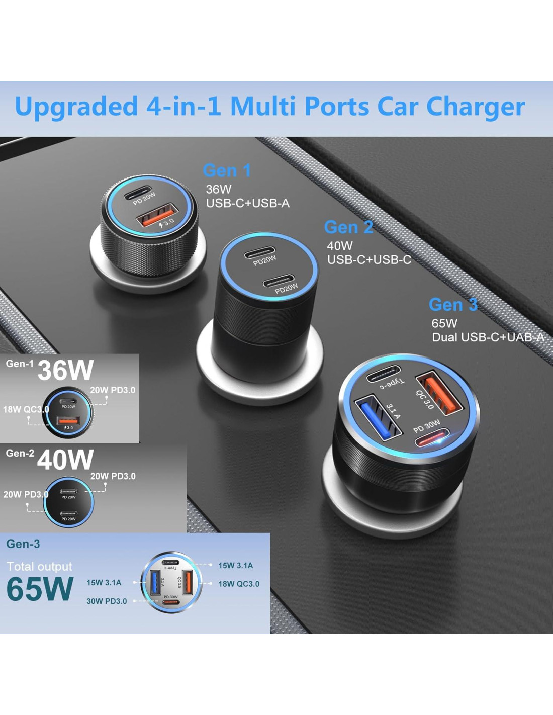 - [Lo que obtienes] Adaptador de cargador de coche USB A y USB C de 65W 4 puertos. Como una marca nueva, nos importa mucho el cliente. Proporcionar productos de alta calidad y un servicio al cliente rápido es nuestro objetivo. Si recibes cargadores defectuosos o tienes cualquier otro problema con nuestros productos, no dudes en contactarnos.