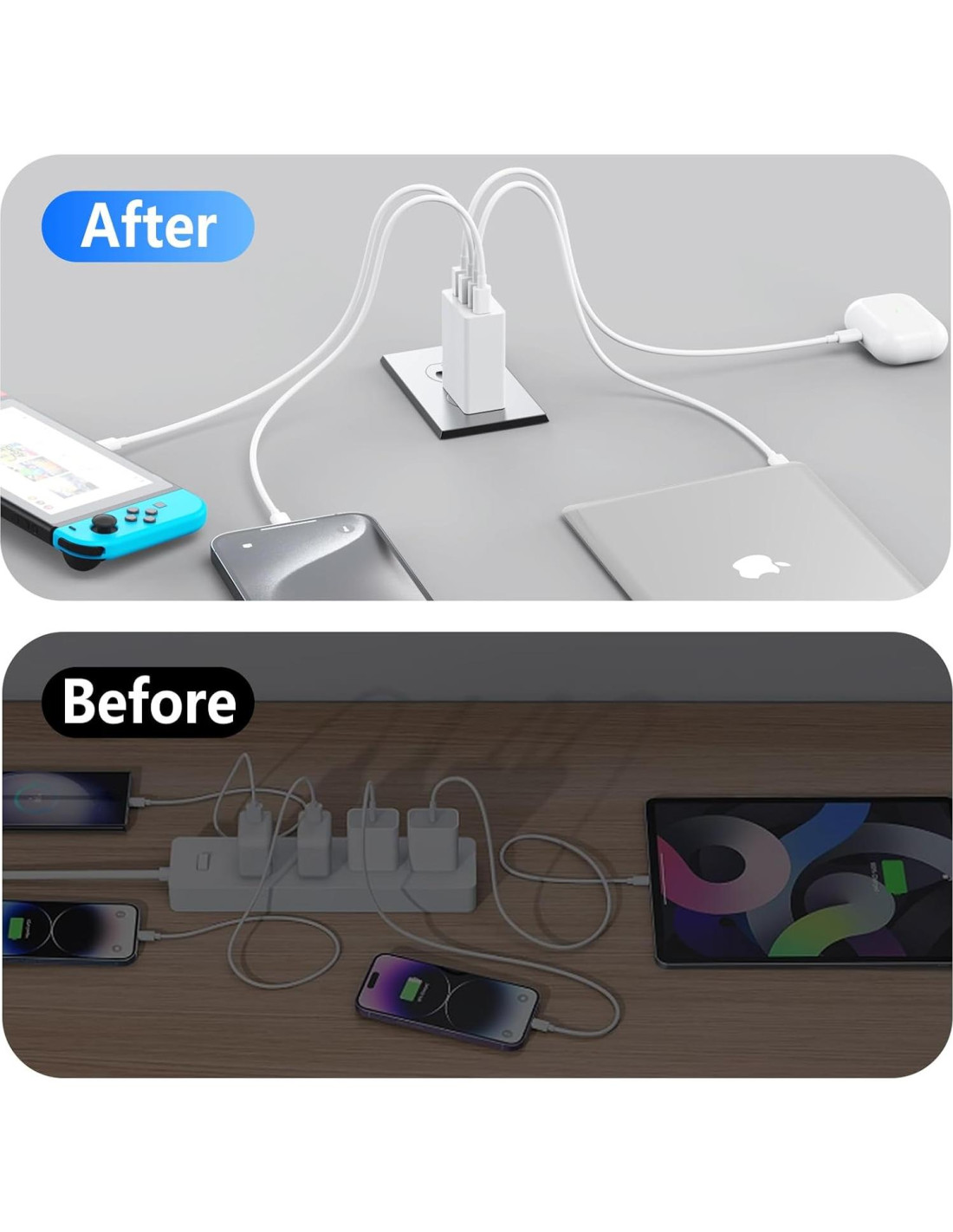 - Para Todos Tus Dispositivos: Debido al especial puerto de 4, el cargador USB es compatible con casi todos los dispositivos electrónicos, adaptador de carga para iPhone 16/16 Pro/16 Pro Max/16 Plus/15/15 Pro/15 Pro Max/15 Plus/14/13/12/11/SE 2020/XR/XS/X/8/7, iPad Air/Pro/Mini, Galaxy, Tablets, LG, Pixel y otros dispositivos digitales compatibles.
