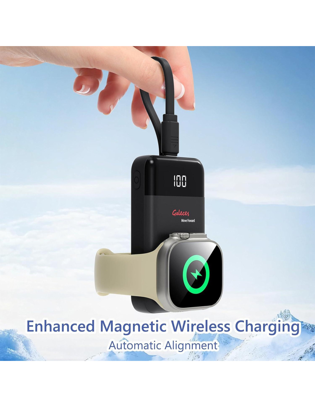 - [Fuerte Adherencia Magnética para Carga Inalámbrica] Este cargador portátil para Apple Watch tiene un fuerte módulo de inducción magnética inalámbrica. Cuando presionas el botón de encendido antes de colocar el reloj sobre el magnético, una vez que la parte posterior del Apple Watch se alinea exactamente con el cargador magnético, la adherencia magnética y el dispositivo comenzarán a cargarse automáticamente al instante.