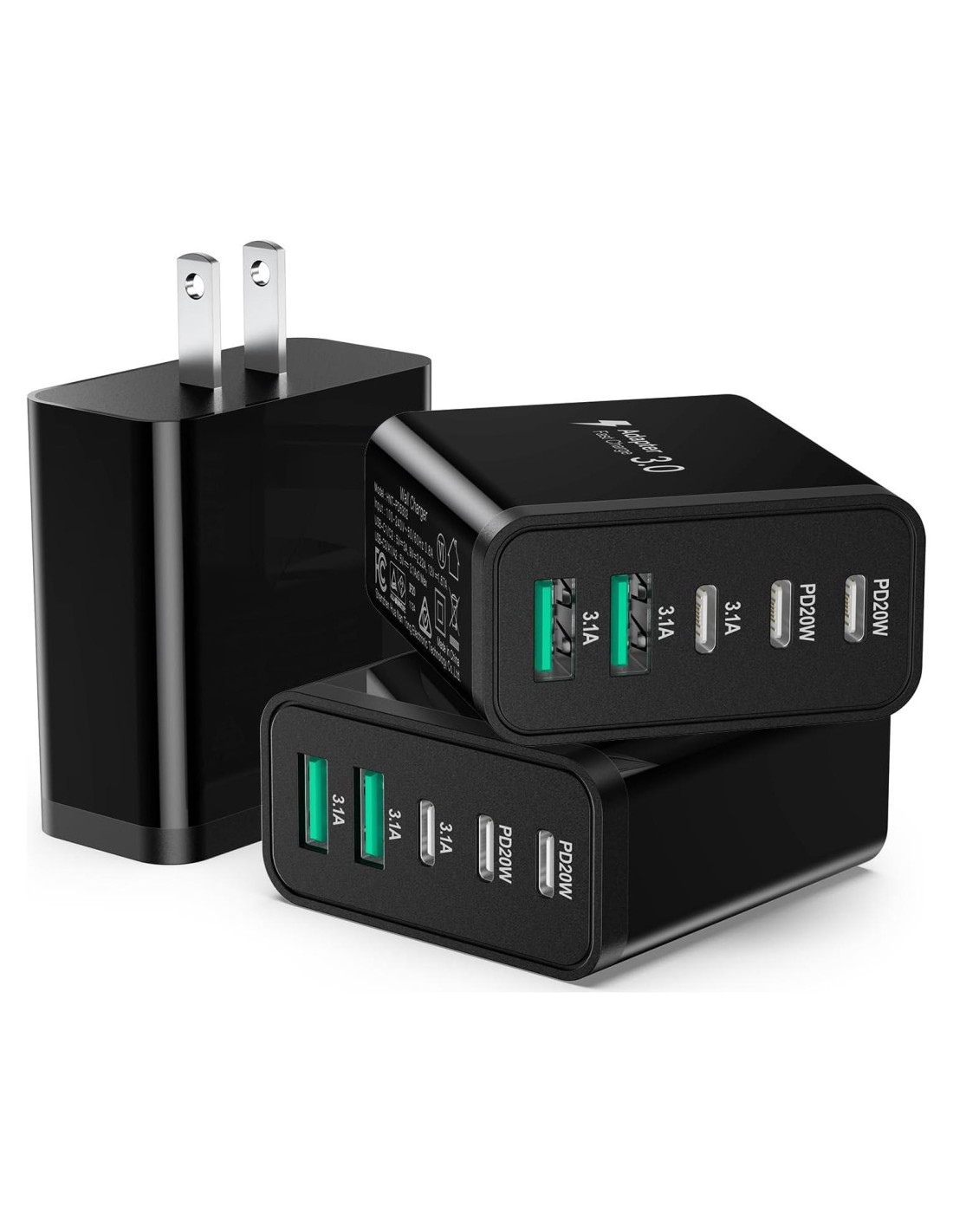 - Bloque de Cargador USB C de Múltiples Puertos: Este cargador de pared USB C entrega hasta 50W de potencia a través de 3 puertos USB-C y 2 puertos USB-A para dispositivos antiguos y nuevos. Puedes cargar tus teléfonos y accesorios portátiles diarios simultáneamente por la noche desde un solo enchufe, como smartphones, tabletas, auriculares, audífonos, relojes inteligentes, etc. A diferencia de otros cargadores de múltiples puertos que solo diseñan 2 puertos USB-C o menos, considerando más dispositivos alimentados por USB-C en el futuro, lo hacemos 3, pero aún a un precio asequible.