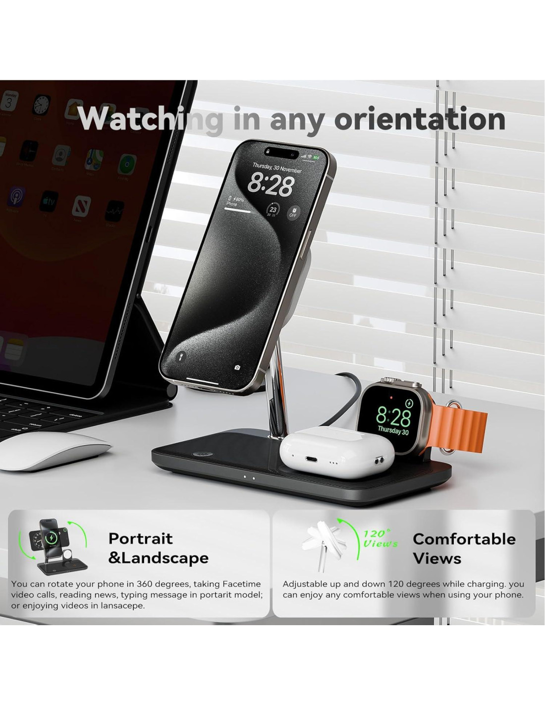 - Diseño Elegante y Versátil: Esta estación de carga inalámbrica de diseño elegante integra 3 cargadores y una luz nocturna, perfecta para tu mesita de noche, oficina o viaje. El soporte de carga del teléfono ajustable ofrece inclinación de 120 y rotación de 360 para una visualización cómoda desde cualquier ángulo.