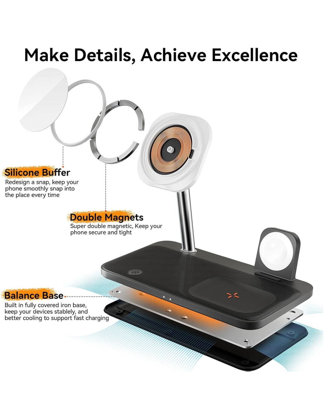 - Conexión Magnética Súper Poderosa: Equipado con tecnología avanzada Super Doble Magnético, sostiene tus dispositivos de manera segura, asegurando una alineación precisa para una carga sin interrupciones. Acopla fácilmente tu iPhone, Apple Watch y AirPods.
