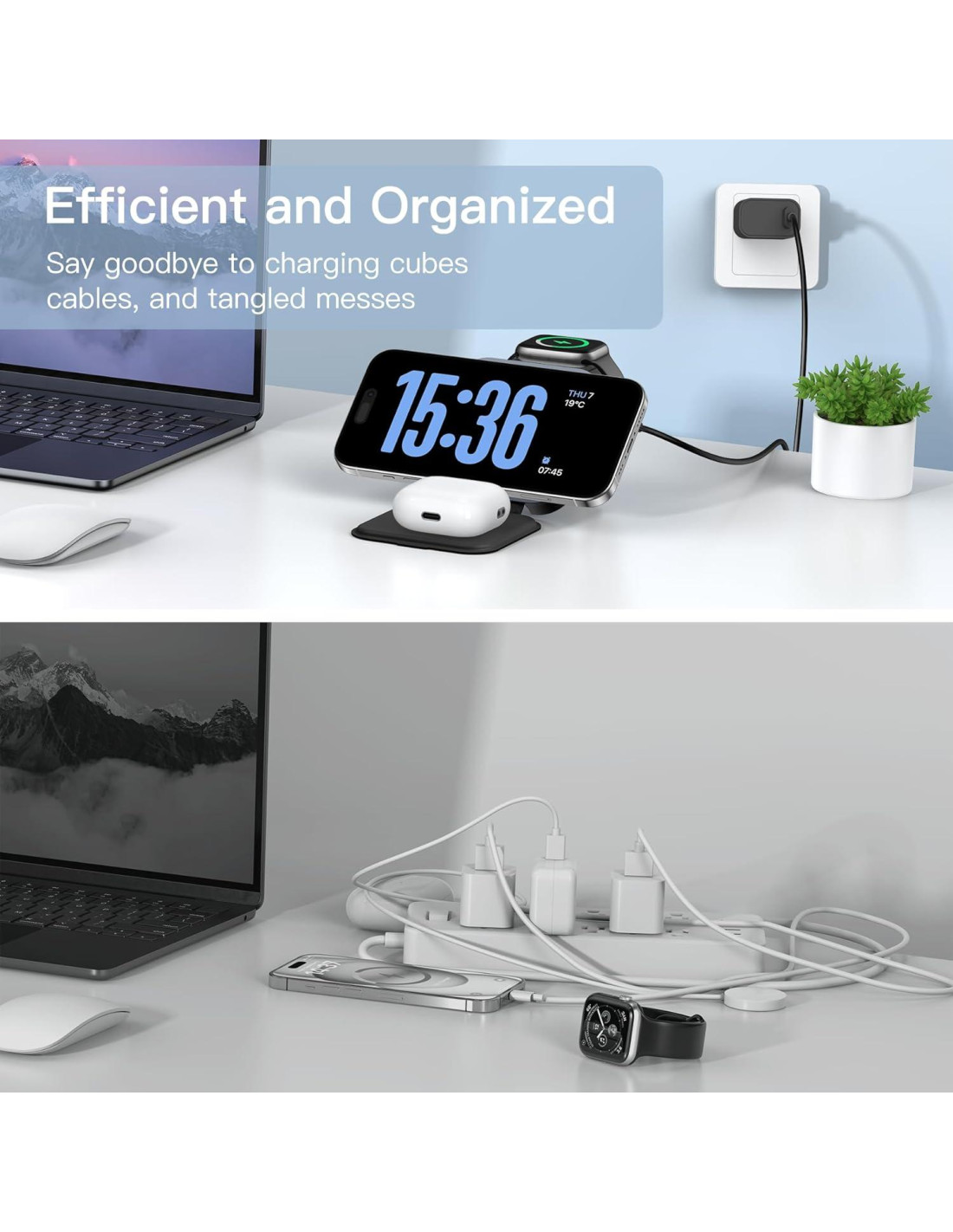 - [Carga Rápida y Compatible con MagSafe]- Compatible sin problemas con MagSafe, carga rápida tu iPhone 15W, Apple Watch/Ultra 2/Ultra/10/9/8/7/6/5/4/3/2 5W (hasta 40% más rápido que 2.5W/3.5W), y AirPods 3.5W simultáneamente. (Nota: Por favor, utiliza el cargador y cable USB-C PD de 20W incluidos para una carga óptima.)