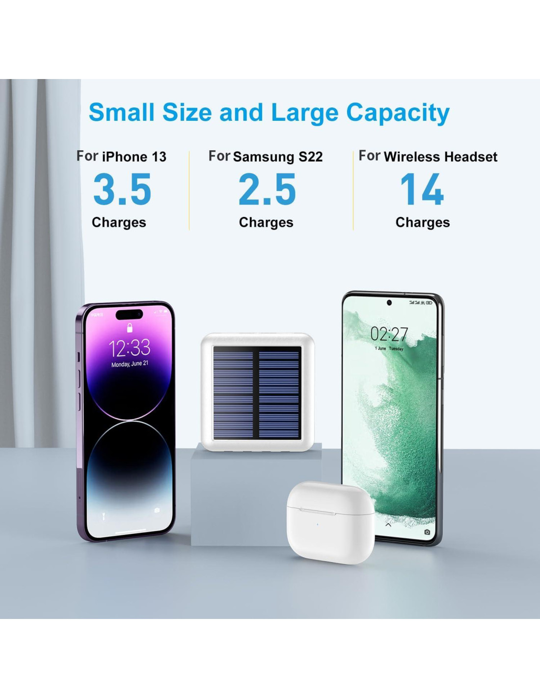 - [Dos Formas de Carga] El cargador de batería externa con panel solar puede recargarse por solar o por toma de corriente. En la vida diaria, recomendamos cargarlo con adaptador, tomando la carga solar como solución de respaldo de emergencia.