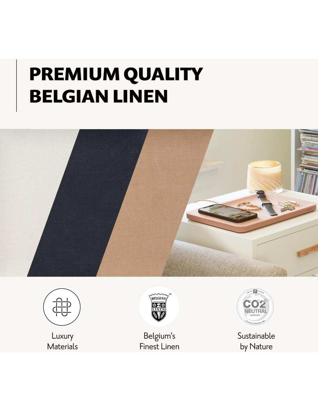 - DISEÑO DE LUJO ENCUENTRA ALTA TECNOLOGÍA: Hecho a medida para elevar la tecnología a un nuevo nivel de diseño. Añadimos lino belga de alta gama, combinado con un marco y cable mate a juego a nuestra tecnología de carga inalámbrica inteligente. Demostrando, una vez más, que la tecnología puede ser vanguardista y elegante.