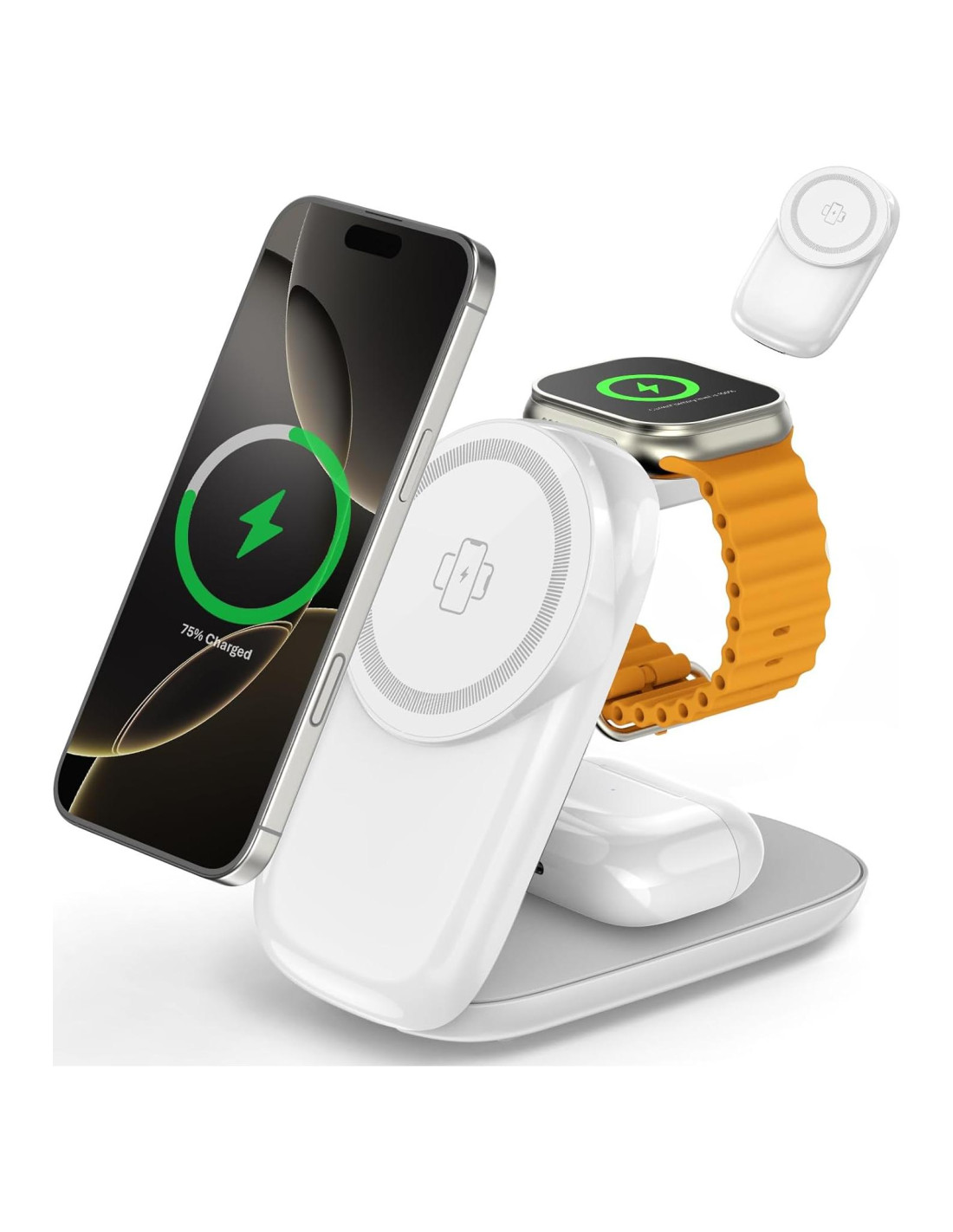 - [2025 Estación de Carga Inalámbrica 3 en 1 Mejorada] Diseñada para fanáticos de Apple, esta estación de carga 3 en 1 es perfectamente compatible con la serie iPhone 16/15/14/13/12/11/Pro Max, Apple Watch 10/9/8/7/6/5/4/3 y AirPods Pro/4/3. La distribución inteligente de energía asegura una carga simultánea eficiente para tres dispositivos, eliminando el desorden de cables; una estación satisface todas tus necesidades de carga de Apple. (Nota: Solo admite dispositivos de carga inalámbrica; AirPods requieren compatibilidad con estuche de carga inalámbrica.)
