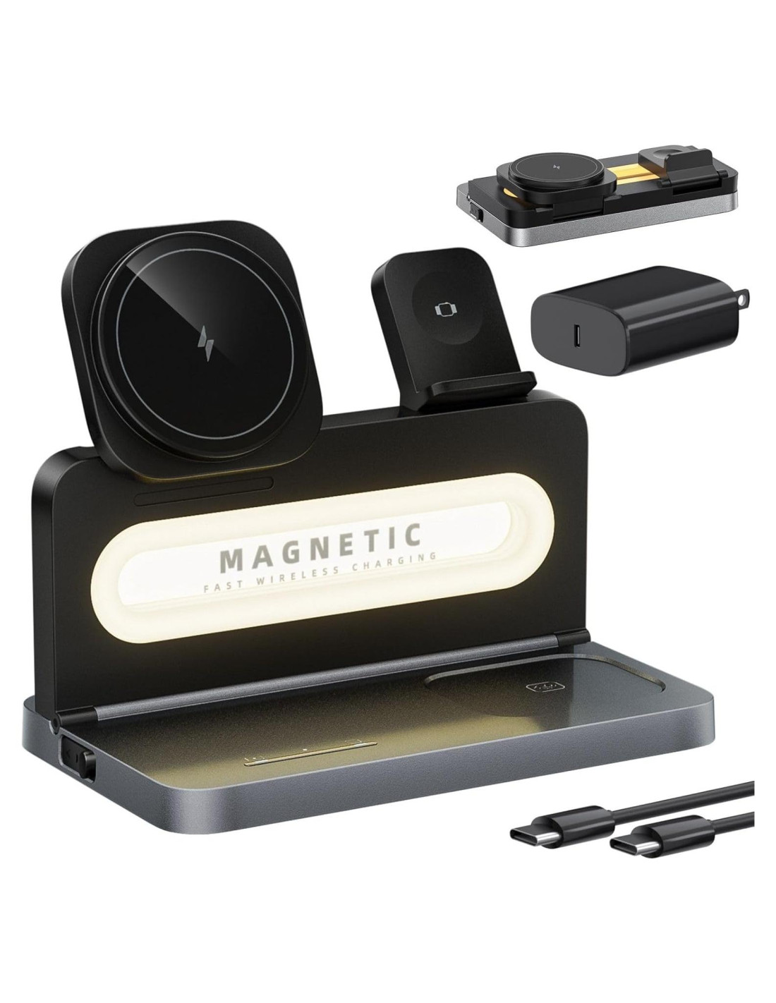 - Lo Que Obtienes: El paquete incluye: Estación de Carga Inalámbrica Magnética 3 en 1, Adaptador USB-C PD 20W, Cable USB C-C (1.5m/5ft), Manual del Usuario. Si tienes algún problema durante el uso, no dudes en contactarnos incluso más allá de la ventana de devolución.