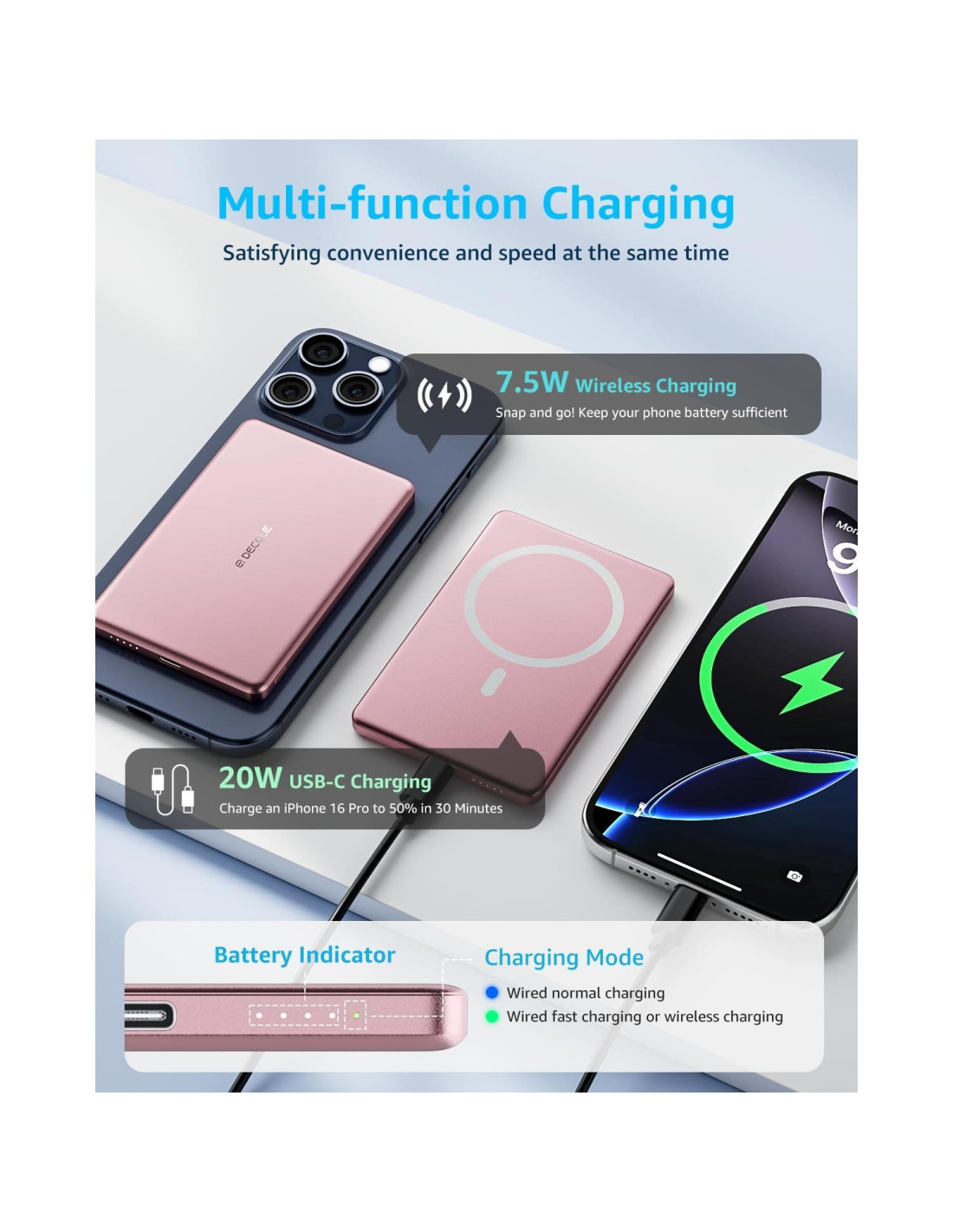 - [Carga por cable e inalámbrica] La batería portátil magnética "Air" proporciona carga inalámbrica QI1 de 7.5W o carga por cable PD de 20W para iPhone. En modo de carga inalámbrica, con la ayuda de un imán de 10N, ¡puede simplemente acoplar y listo! Mantenga la batería de su teléfono suficiente. En modo de carga por cable, puede cargar un iPhone 16 Pro al 50% en 30 minutos.