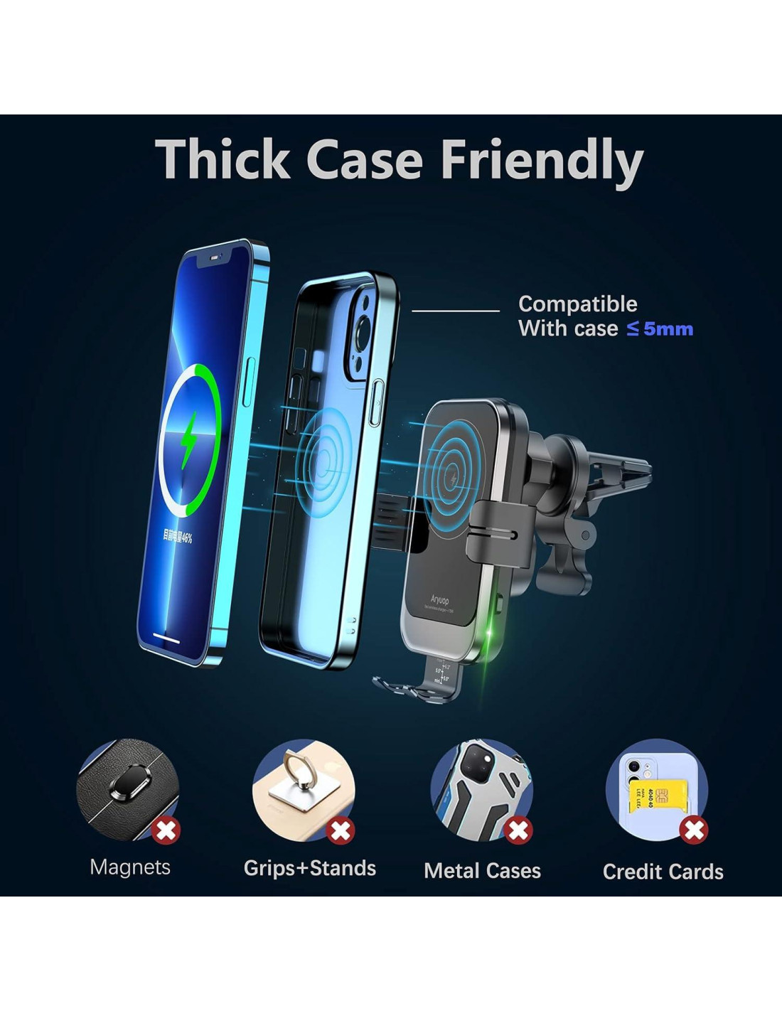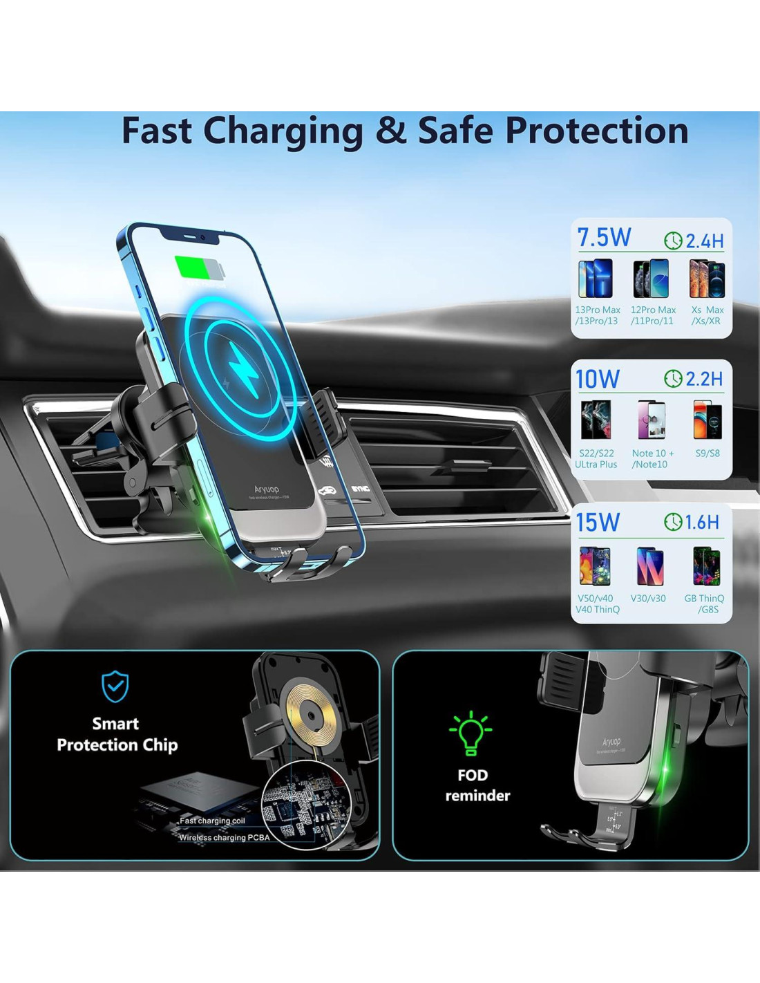 - DETECCIÓN DE OBJETOS EXTRAÑOS con ALARMA LED: El soporte de cargador inalámbrico para coche Aryuop admite carga a través de fundas de teléfono de hasta 4.5 mm de grosor. La detección de objetos extraños (FOD) previene la carga anormal de equipos, por favor retira objetos metálicos/magnéticos, tarjetas de crédito o soportes emergentes antes de cargar.