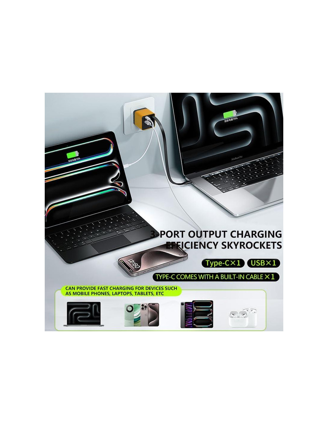 - [Cable Retráctil Máximo de 65CM] El bloque de cargador rápido de 80W máx 3 en 1 viene con cables tipo C retráctiles de 65 cm. La longitud máxima retráctil de los cables de carga es de 65 cm (25.59 pulgadas). La velocidad de carga normal para el iPhone 17/17 Pro Max/17 Air es de 27W, Galaxy S25 Ultra es de 45W, Pixel 9 Pro es de 37W, perfecto para cargar teléfonos Android, tabletas o laptops con puertos USB-C. Los cables están almacenados ordenadamente, y después de desconectar, solo necesitas estirar suavemente 1 cm para retraerlos.