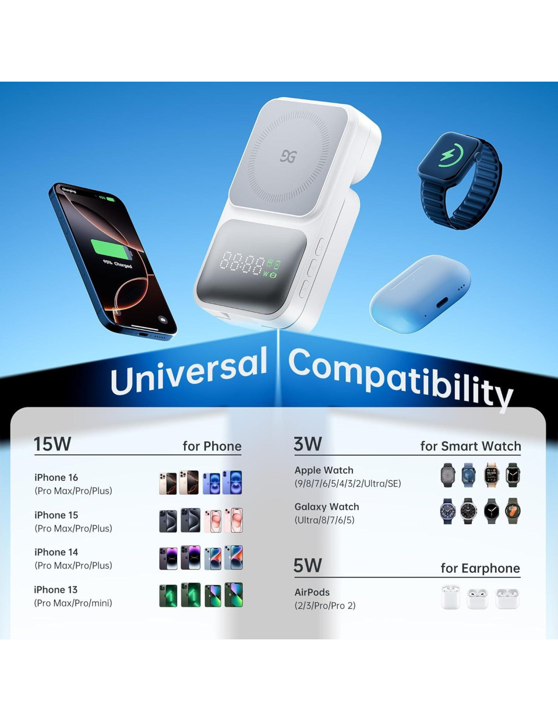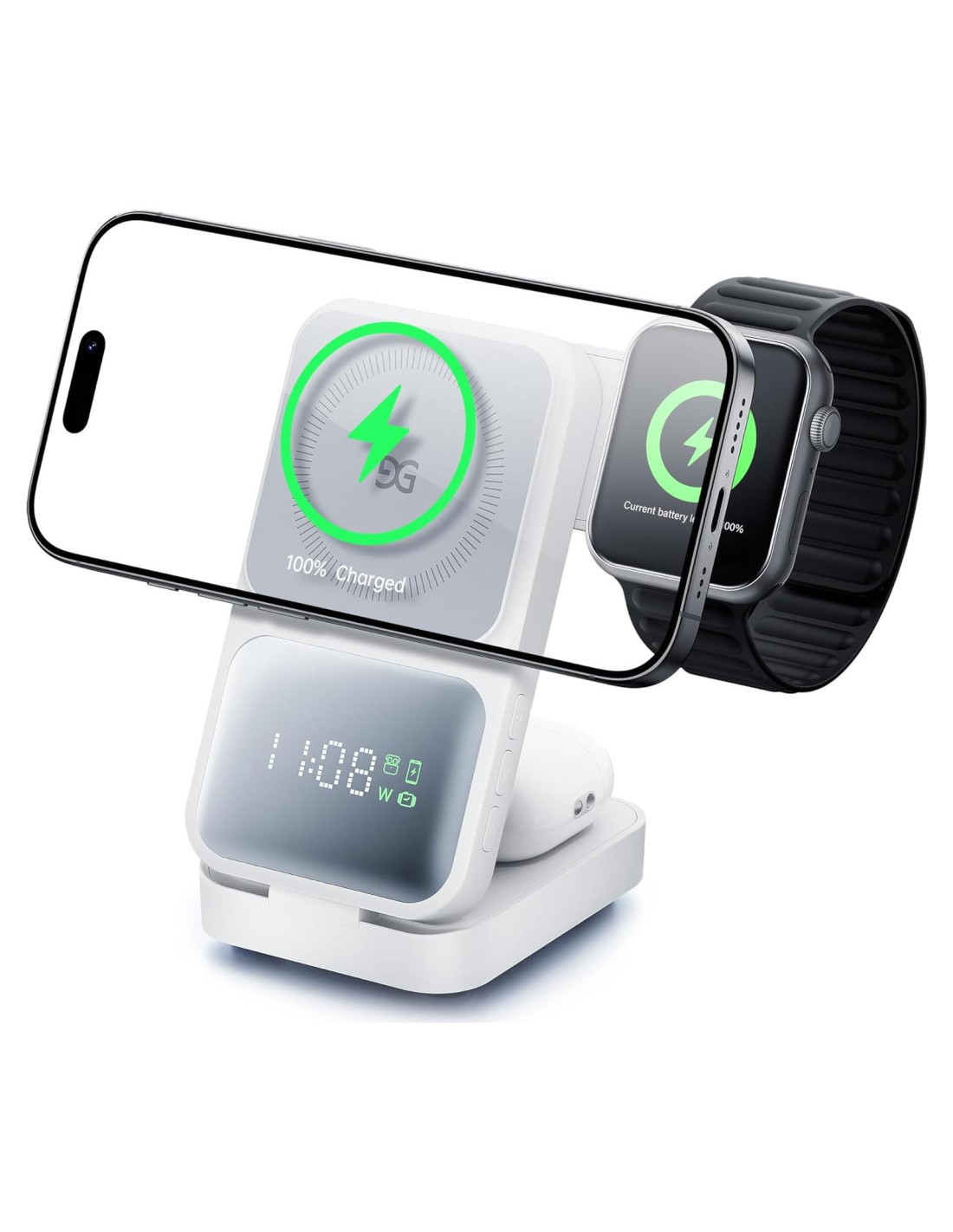 - Integración Perfecta con el Ecosistema de Carga: A medida que los dispositivos inteligentes se convierten en una parte esencial de nuestras vidas, simplificar sus necesidades de energía es más importante que nunca. Nuestra estación de carga inalámbrica 3 en 1 alimenta tu teléfono, auriculares y reloj inteligente simultáneamente. Cuenta con una pantalla incorporada que muestra la potencia de carga en tiempo real para cada dispositivo, junto con la hora actual; clara, intuitiva y fácil de monitorear. No se necesitan aplicaciones; solo coloca tus dispositivos en el soporte y carga al instante, manteniéndote informado en cada paso del camino.
