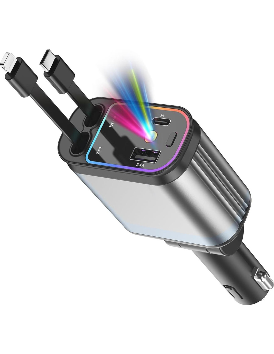 - Diseño Integrado de Conveniencia Retráctil: Este innovador cargador de coche cuenta con un diseño 4 en 1 sistema de cargador USB de coche multipuerto con un cargador de coche compatible con iPhone que incluye dos cables de carga retráctiles (Type-C e iOS) y dos puertos USB (USB-C y USB-A). Carga hasta cuatro dispositivos a la vez, simplificando tus necesidades de carga mientras mantienes tu coche ordenado.