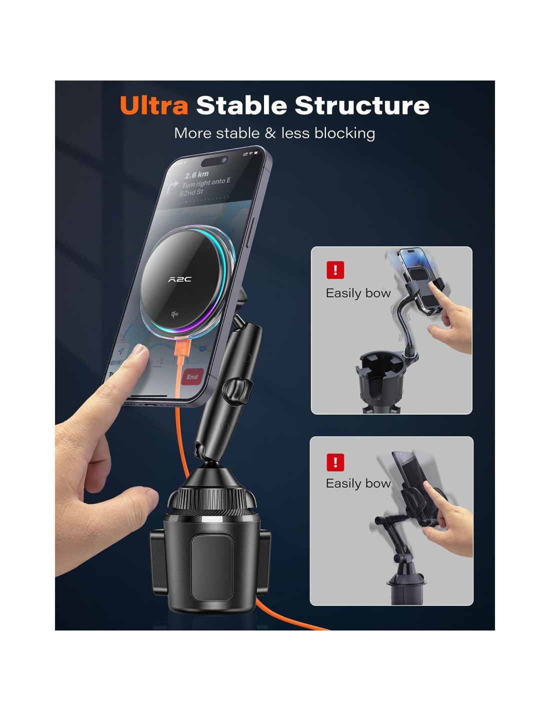 - Soporte de taza ajustable de alta resistencia: La base de montaje ajustable tiene 3 garras gruesas con almohadillas de silicona que se ajustan de manera segura en un soporte de taza de coche entre 7.67 cm y 11.73 cm de diámetro, sin tambalearse incluso en un camino accidentado, absorción de impactos y silencio.