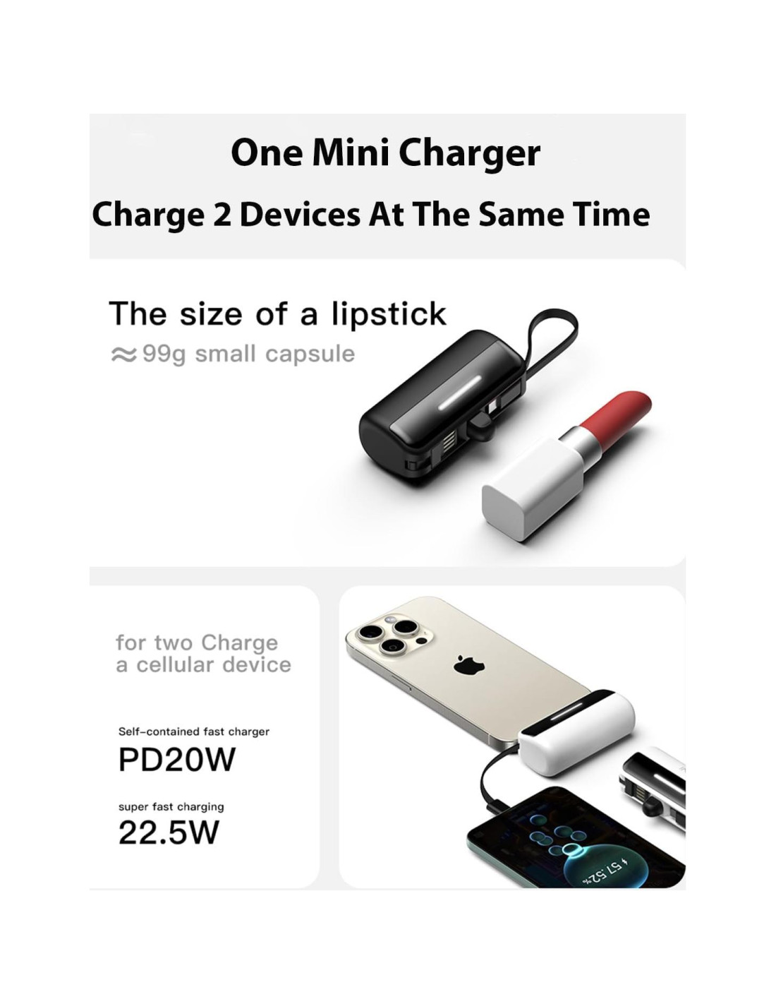 - [Compacto y Portátil para Viajes Fáciles] Diseñado para ser compacto y ligero, este banco de energía portátil mide solo 7.87 x 2.29 x 4.83 cm y pesa solo 90.7 gramos, aproximadamente del tamaño de un lápiz labial. Se adapta fácilmente a tu bolsillo, bolso o mochila, lo que lo hace fácil de llevar. Además, viene con una correa portátil, lo que te permite colgarlo en tu bolsa o cartera, liberando tus manos y asegurando que tus dispositivos siempre estén cargados mientras estás en movimiento.