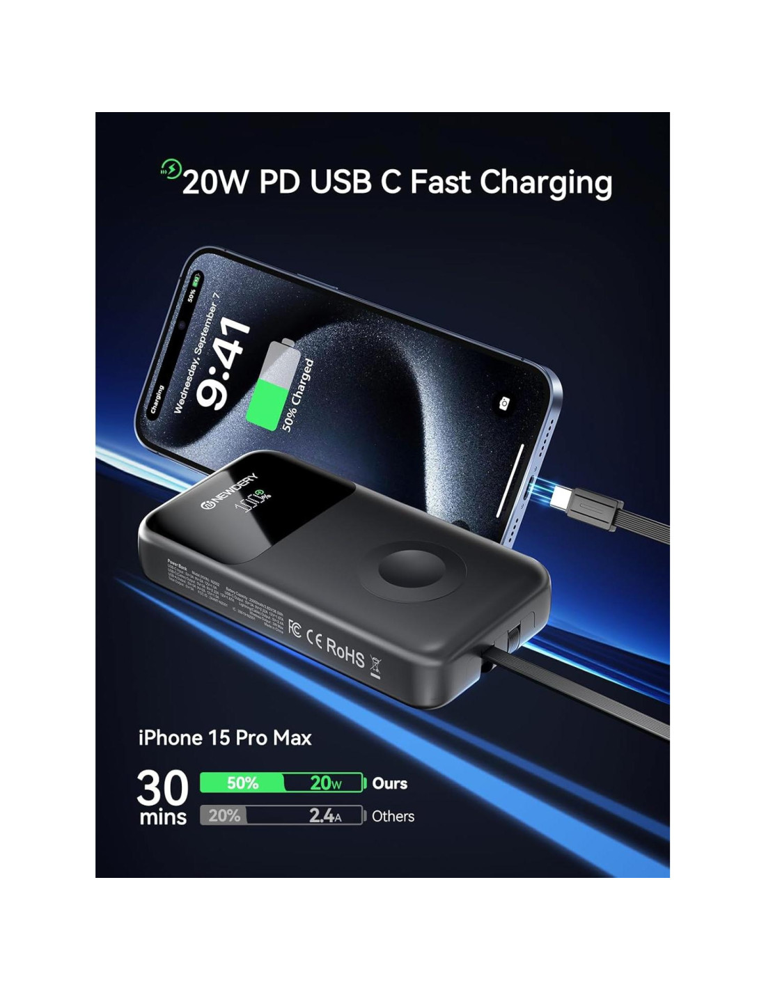 - Características especiales: Cargador portátil con cables integrados, con entrada y salida USB C, salida USB A, carga rápida USB C de 20W, pantalla digital, soporte para carga a través, carga de múltiples dispositivos simultáneamente, carga inalámbrica iWatch