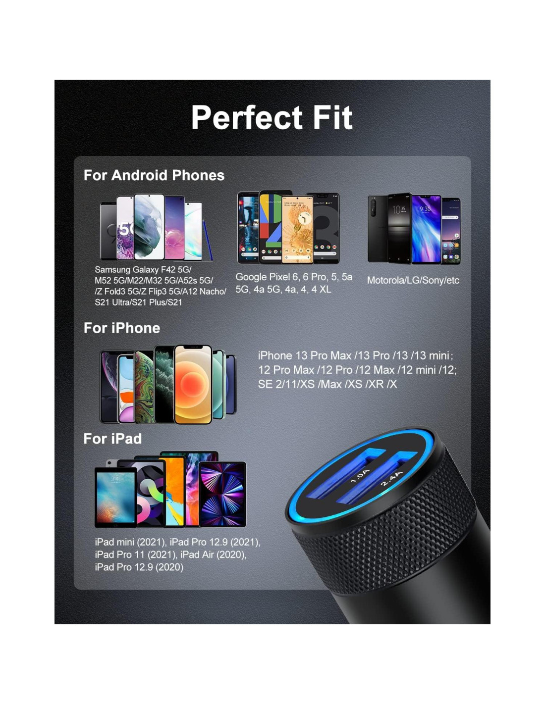 - Amplia Compatibilidad: Cargador de coche USB A funciona para los últimos smartphones o tabletas, iPhone 15/15 Pro/15 Pro Max/15 Plus/14 Pro Max 14Pro 14 Plus 13 13Pro 12 12Mini 12 Pro Max SE 11 Pro Max XR XS X 8 Plus 7 6s, iPad Pro/Air/mini. Samsung Galaxy S23 S23+ S22 Ultra S22+ S21+ S21 5G Note 20 Ultra 10 Plus S20 S10 S10E A14 A13 A53 S9 S9 Plus S8+ Note 9, Google 7 Pro 7 7a 6 Pro 5a 5 4xl 3xl 2xl 3a 4 4a 3 2, LG, Oneplus, HTC, Blu, LG, Motorola, Relojes Inteligentes, Kindle, etc.