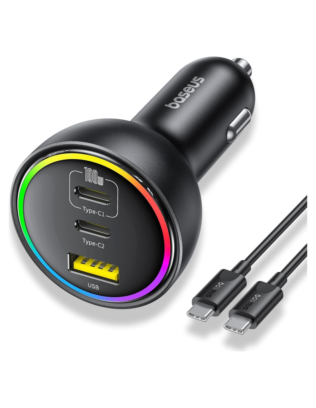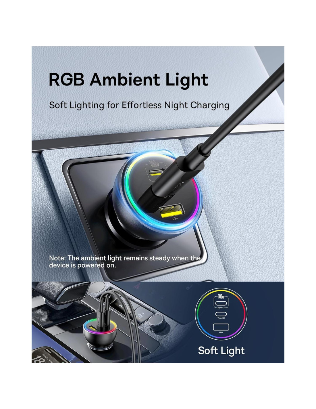 - Luz ambiental RGB elegante: El adaptador de cargador de coche puede iluminar el interior de tu coche con un elegante diseño de luz RGB. La suave luz indicadora multicolor no solo mejora tu experiencia de conducción por la noche, sino que también te permite localizar rápidamente los puertos de carga, haciendo que la carga nocturna sea sin esfuerzo. Incluye un cable de carga rápida de 100W duradero para mayor comodidad.