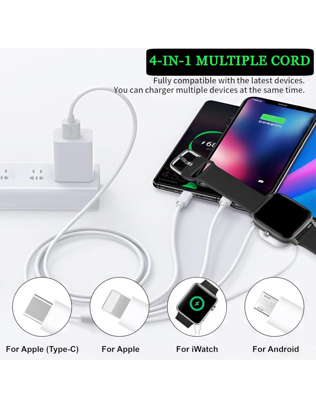 El cable de carga 4 en 1 está diseñado para Apple Watches Series, teléfonos móviles y dispositivos electrónicos. ¡No uses 4 cables diferentes cuando todo lo que necesitas es uno! ¡Tenemos muchas opciones y estilos que se adaptan a los dispositivos que tienes! Tenemos un cable de carga para reloj 4 en 1 para dispositivos Apple, Micro y Tipo-C. Puede soportar la carga de 4 dispositivos al mismo tiempo. El cable de carga para reloj es ligero y duradero, con una longitud de 1.0 m, es un diseño portátil y compacto para llevarlo fácilmente a cualquier lugar, viajar, en el coche, en la oficina, en movimiento, etc. Nuestro cable de carga múltiple es compatible con iPhone 16/15/14/13/12/11/11/XS/Pro/Max/XR/8/8 Plus 7/7 Plus, teléfono 6/6 Plus, iPad, iPad Air, iPad mini. Tipo-C para Samsung Galaxy S24 S23 S22 S10 S9 S8 Note 9 8, LG G5 G6 V20, Google Pixel, Google Nexus 5X 6P, Huawei P9 10, Lumia 950, Lumia 950 XL, One Plus. Micro USB para Samsung S6/S4, HTC, Sony, la mayoría de los teléfonos Android, Pods y cualquier auricular TWS. Cargador magnético para reloj iWatch Series 10/9/8/7/6/SE2/SE/5/4/3/2/1/Ultra 2/Ultra/Nike+/Herms/Edición. CARACTERÍSTICAS CLAVE: - Cable de carga 4 en 1 - Portátil y duradero - Soporta carga rápida - Compatibilidad universal