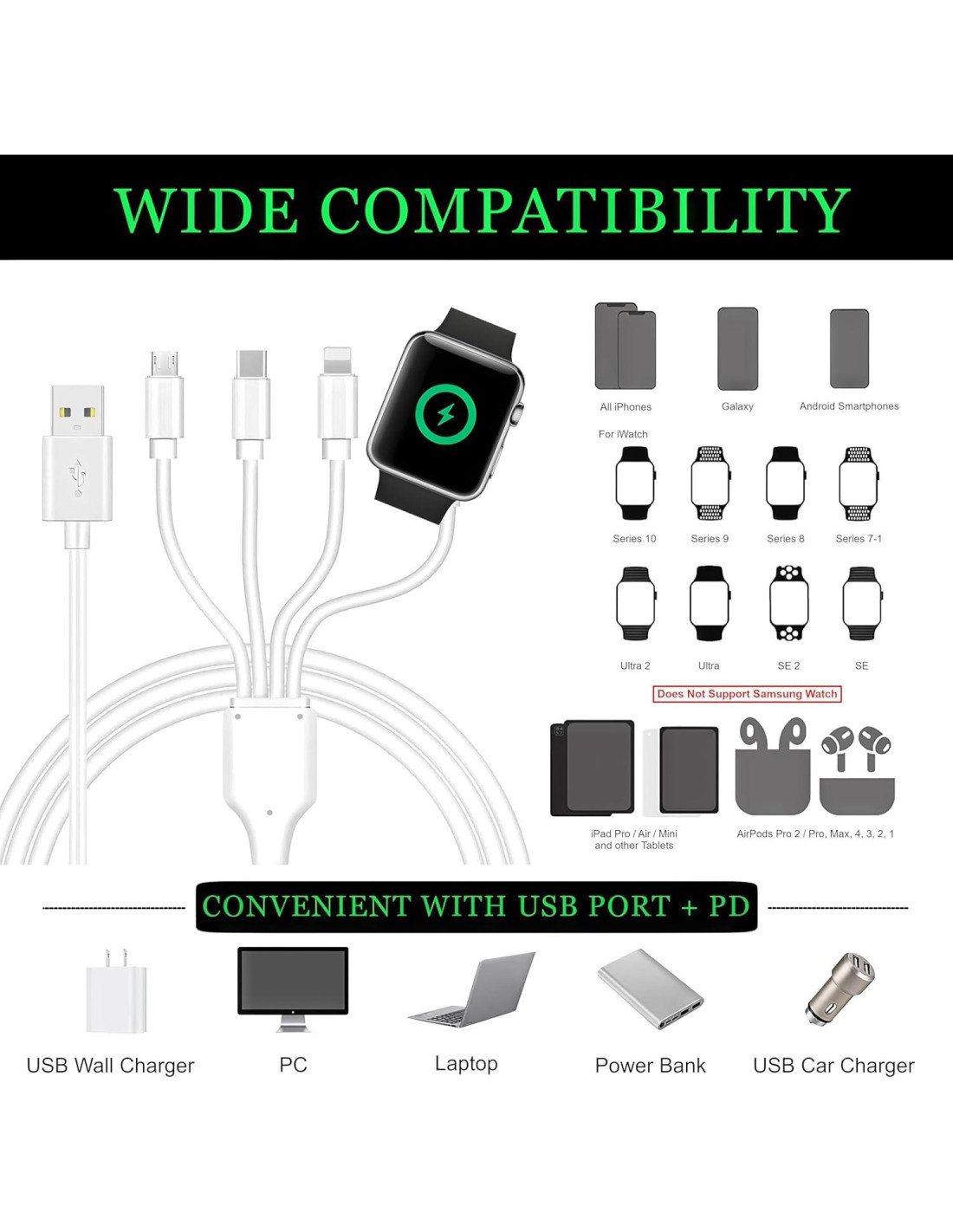 - [COMPATIBILIDAD UNIVERSAL] Nuestro cable es compatible con la serie de relojes 10/9/8/7/6/SE2/SE/5/4/3/2/1/Ultra 2/Ultra/Watch Nike+/Watch Herms/Watch Edition, iPhone 16/15/14/13/12/12Pro/11/11Pro/XS/XS Max/XR/8/8 Plus 7/7 Plus, serie iPad, AirPods 4/3/2/1/Pro 2/Pro/Max. Tipo-C para Samsung Galaxy, LG, Google Pixel, Nexus, Huawei, Lumia, One Plus. Micro USB para la mayoría de los teléfonos Android, Pods, auriculares TWS y más
