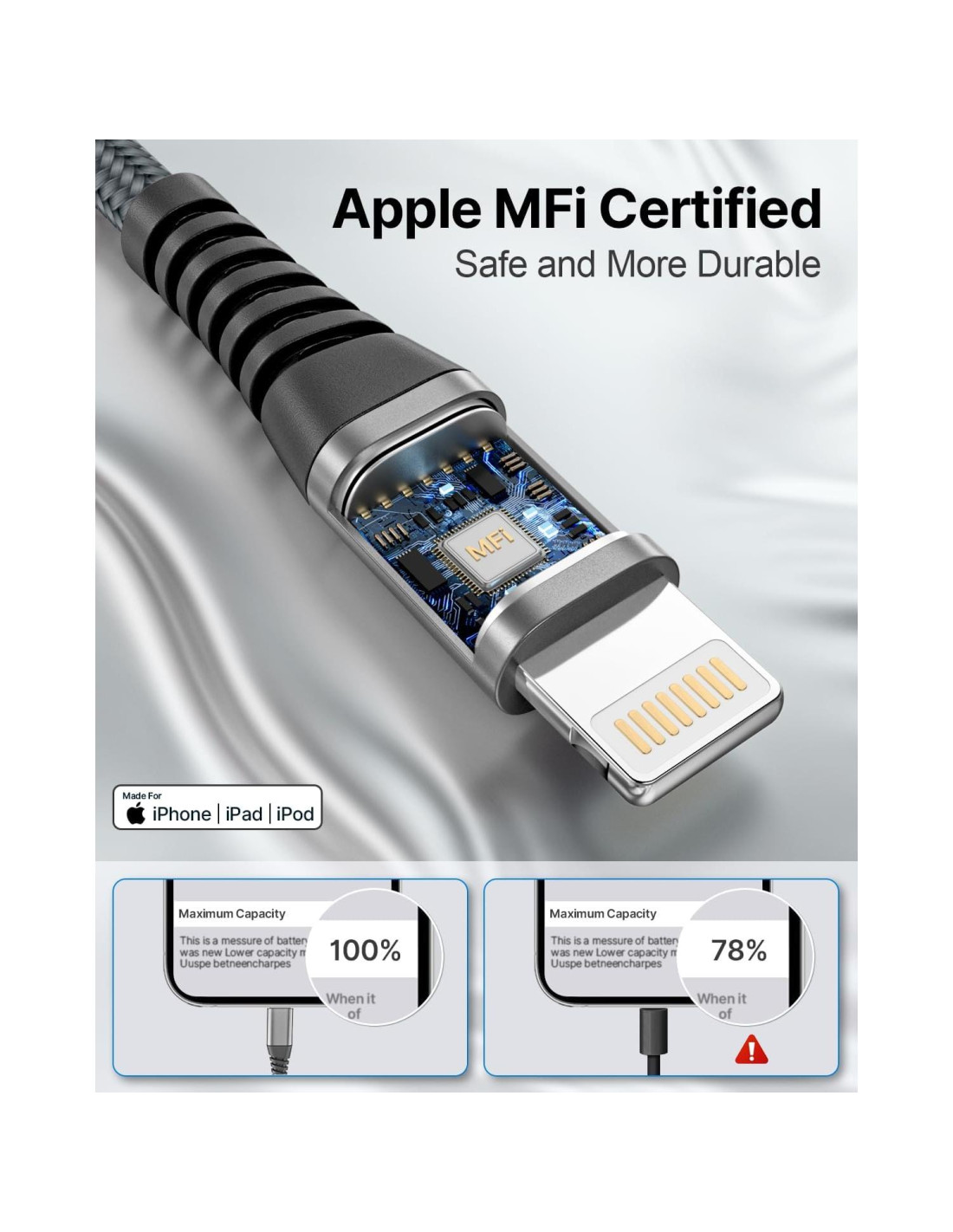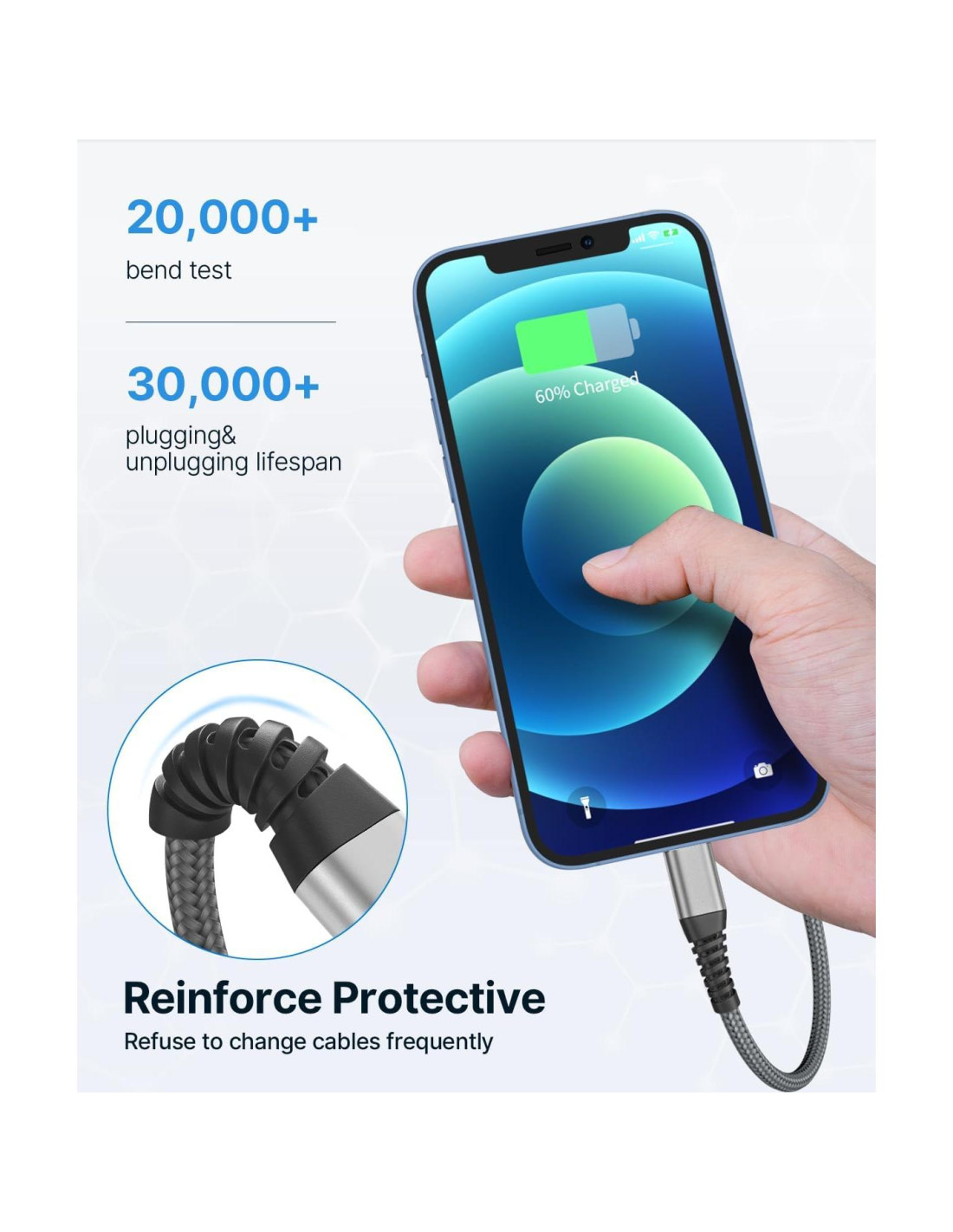Diseñado con una fuerte carcasa de aluminio y una chaqueta trenzada de nylon sin enredos. La carcasa de aluminio proporciona una fuerte protección para los componentes internos y mejora la durabilidad del cable lightning. Ya sea que estés relajándote en el sofá, trabajando en tu escritorio o incluso acostado en la cama, la longitud de 3M (10 pies) asegura que puedas usar y cargar cómodamente tu iPhone o iPad sin estar confinado a un solo lugar.