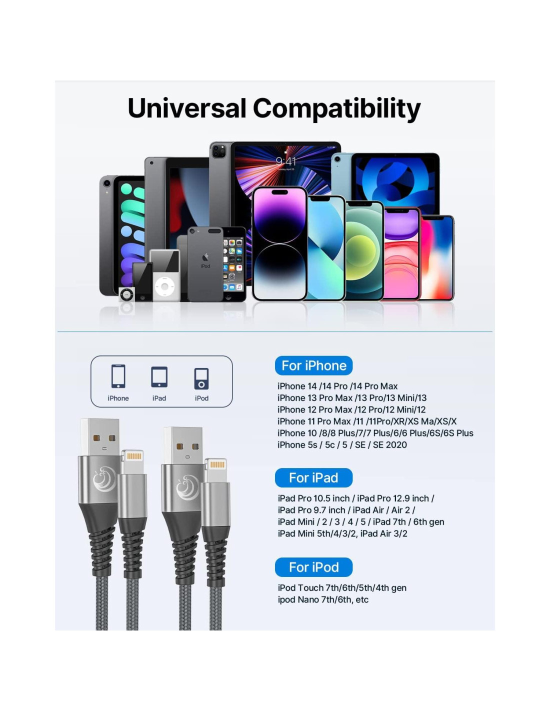 - [Cable de iPhone Súper Duradero] : Fibras de nylon militar fuertes, el material más flexible, potente y duradero, aumenta la fuerza de tracción en un 200%. La tecnología de soldadura láser incorporada asegura que la parte metálica no se rompa. Con más de 10,000 pruebas de flexión, el cable trenzado de nylon USB para iPhone flexible y duradero tiene una vida útil más larga y nunca se romperá.