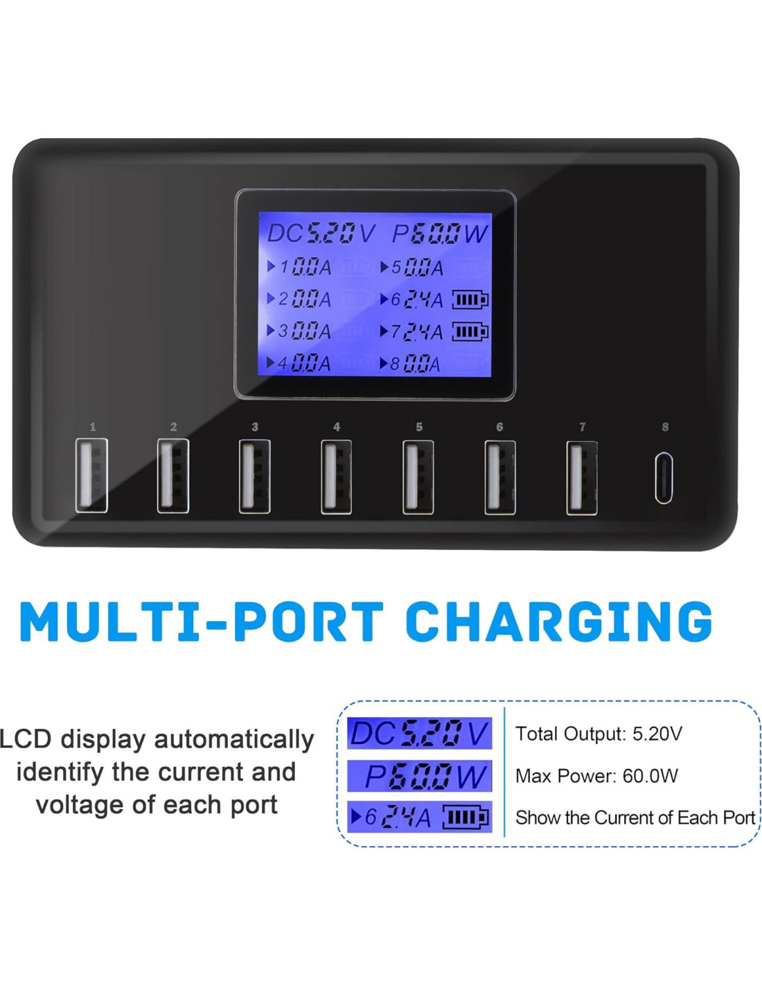 - Características especiales: Protección contra Cortocircuito, 8 Puertos, Indicador de Carga