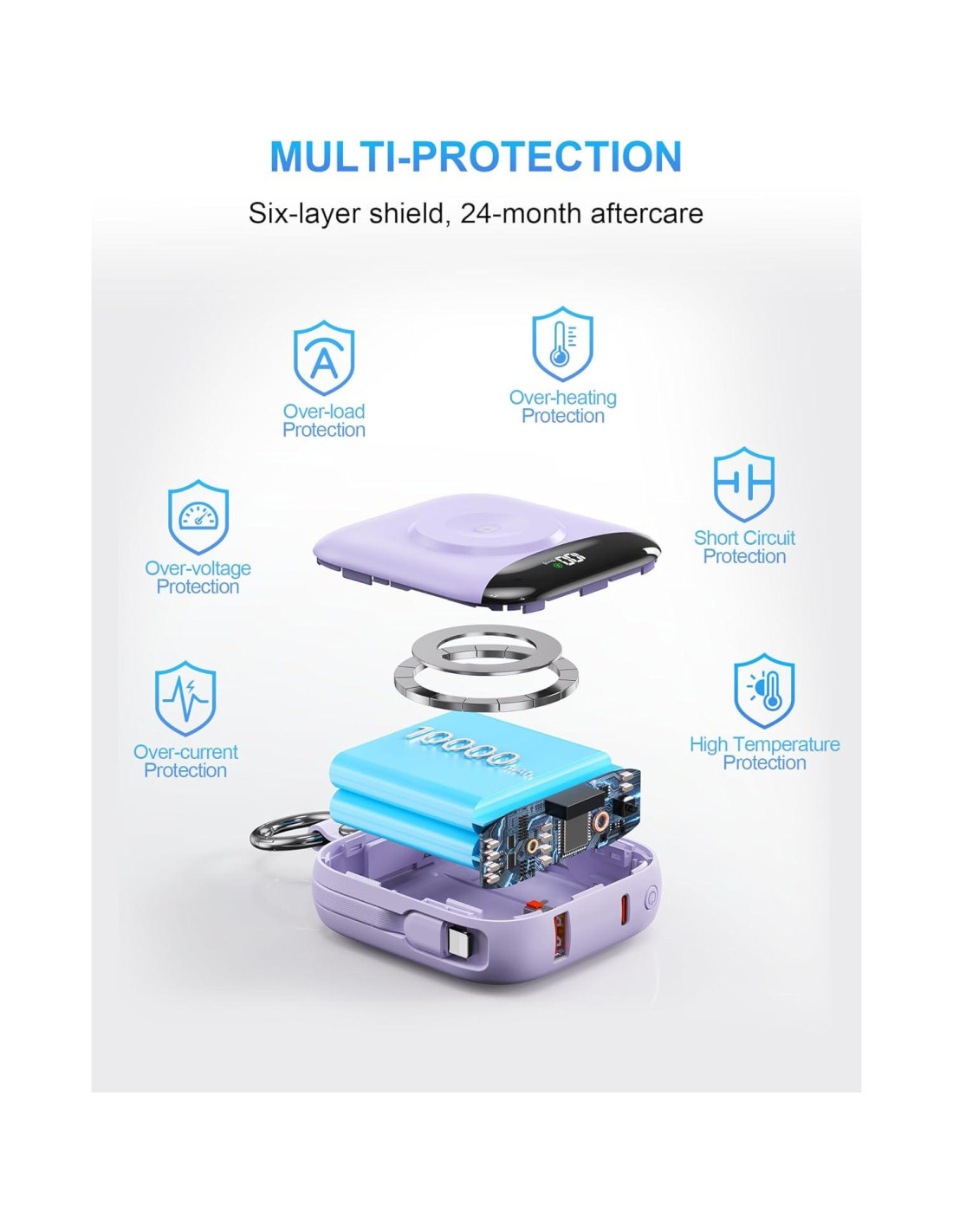 - [Adjunto con cables iOS y tipo-C significa que nunca estarás buscando cables, combínalos con 2 puertos USB para hacer que la batería externa cargue 5 dispositivos simultáneamente, tu iWatch, teléfonos, tabletas, auriculares o cámaras. Un imán perfectamente alineado de 3.5W se adhiere a iWatch Series 10/9/8/7/6/SE/5/4/3 & Ultra/Ultra 2 en su lugar y entrega aproximadamente 25 cargas completas en un solo ciclo de banco.