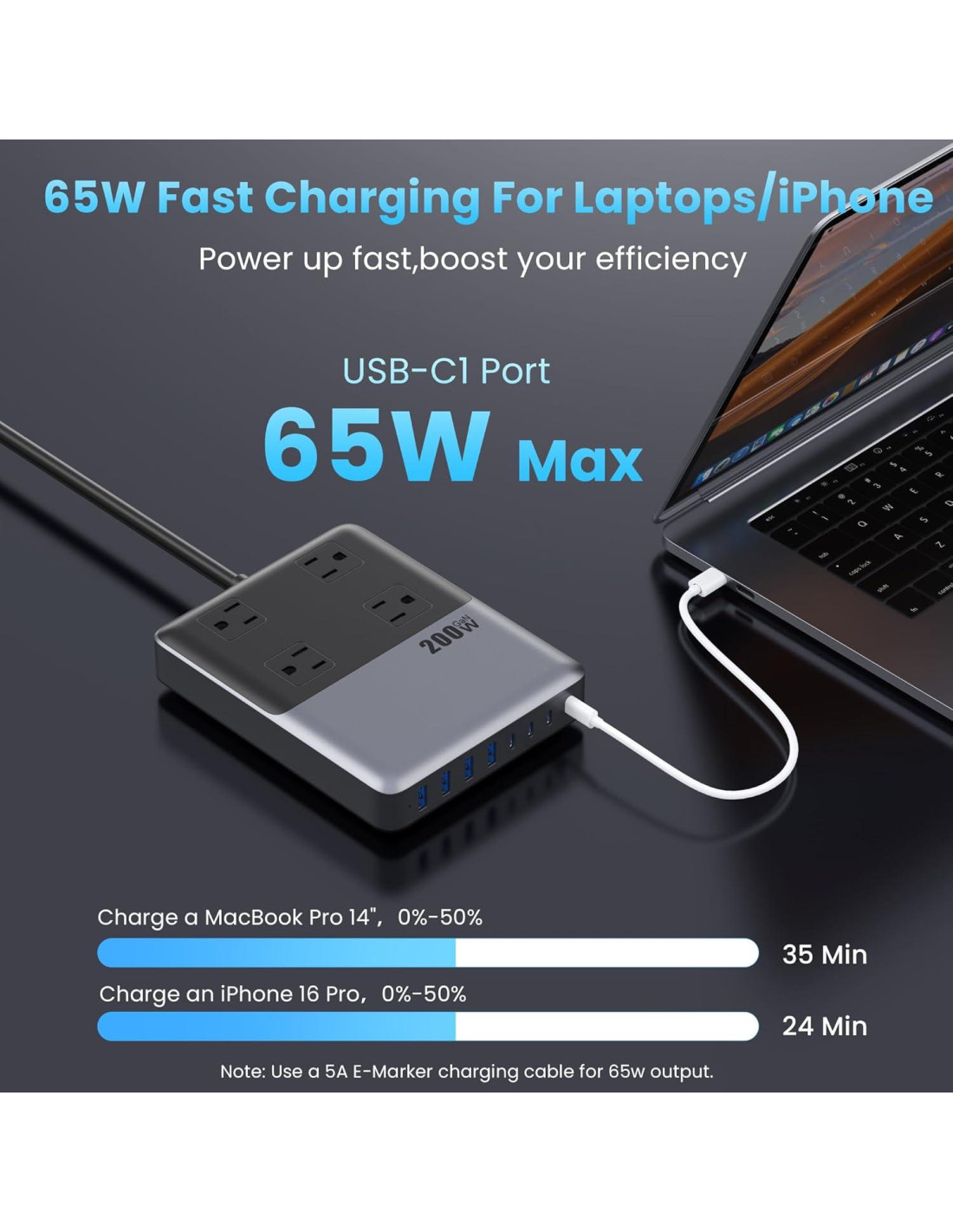 Increíble cargador multifuncional super cargador, no solo es una estación de carga usb sino también una regleta, satisfaciendo todas tus necesidades de carga en casa, oficina y dormitorio. Ampliamente compatible con tus electrodomésticos, laptops, iPhone, teléfonos Android y más.--------------------------------------------Este super cargador de alta eficiencia adopta una arquitectura innovadora ultra delgada y ultra compacta, mejorando enormemente la utilización del espacio, satisfaciendo todas tus necesidades de carga en casa, oficina y dormitorio.-- Regleta 12-en-1 con Cargador USBEquipado con 4 salidas AC, 4 puertos USB-A y 4 puertos USB-C para multitarea eficiente y carga rápida en una estación de carga compacta.-- Estación de Carga Ultra-Poderosa de 200W con Energía AC12 Puertos 1 cargador, alimenta 12 dispositivos simultáneamente en un lugar conveniente, diseñado para manejar todos tus dispositivos sin esfuerzo.-- Cargador GaN PD 65W USB C Carga Ultra-RápidaAprovecha el puerto USB-C1 de 65W para cargar rápidamente tu MacBook Pro de 14 pulgadas alcanzando el 50% en solo 35 minutos.-- Tecnología GaN IV AlimentadaTecnología exclusiva GaN IV y sistema de protección múltiple que ofrecen seguridad integral, monitoreando continuamente las temperaturas de carga para asegurar que tus dispositivos se carguen de manera segura.-- Arquitectura Innovadora Ultra Delgada y Ultra Compacta1. El enchufe plano adopta un diseño de ángulo recto de 45 para crear un espacio extra para otros enchufes debajo sin bloquear.2. Longitud del cable de extensión de 5 pies permite cargar en un rango más amplio, sin limitaciones de cable corto.3. Dos salidas AC espaciadas 1.77 pulgadas, más grandes que el estándar de 1.5 pulgadas, se adaptan perfectamente a adaptadores grandes comunes sin bloquearse entre sí.4. Diseño que ahorra espacio, tamaño de 6.2x4.9x1.06 pulgadas, peso 0.64 kg, asegura que tu escritorio permanezca libre de desorden mientras entrega energía confiable de manera constante. Múltiples protecciones para asegurar la seguridad del equipo desde adentro hacia afuera, con certificación autorizada CE, FCC, UL, utilizando núcleo de cobre de alta calidad para estabilizar la salida y reducir el calor, carcasa ignífuga, ¡la seguridad es la primera garantía!Cargador de regleta USB con voltaje de amplio rango (100V~240V, 50/60Hz), ampliamente compatible con varios tipos de dispositivos:1. 1800W 4 Salidas AC para Electrodomésticos como Computadora de Escritorio, Laptops, TV, Proyector, Impresora, Consola de Juegos, Cafetera, Afeitadora, Cámara, Colector de Polvo y más.2. Salida PD 65W USB C1 para Laptops y Tablets3. 200W 8 Salidas USB para Todos los Smartphones---------------------------------------------Lista de Paquete:1 X Estación de Carga Regleta USB (12-en-1, 200W, Tecnología GaN4)1 X Manual del Usuario
