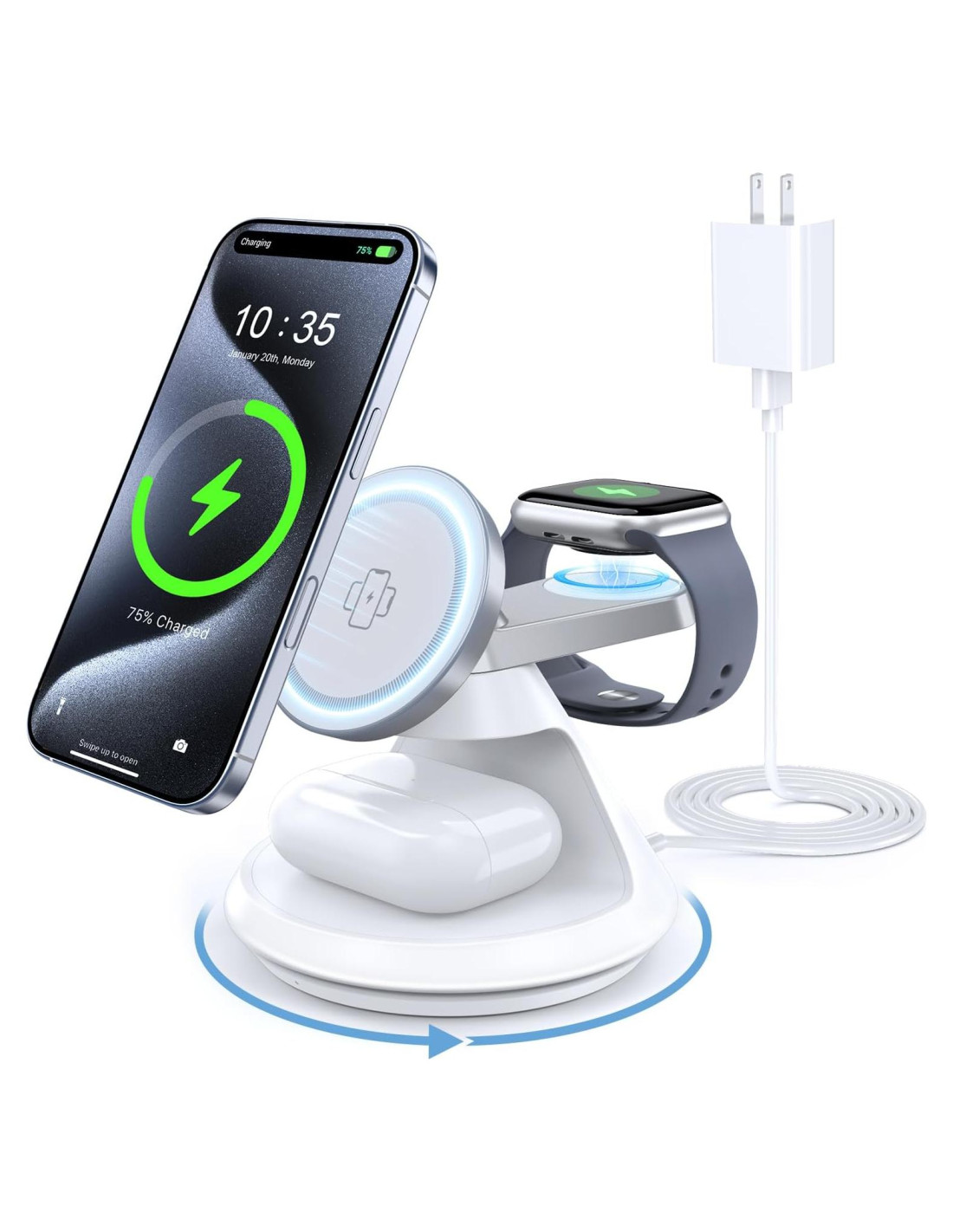 - [Base Estable Rotativa de 360 Mejorada] A diferencia de los cargadores inalámbricos 3 en 1 estándar con bases fijas, el nuestro cuenta con una base rotativa de 360 para una colocación flexible. Este soporte de cargador inalámbrico cuenta con una base robusta y estable y una estructura de soporte reforzada que no se romperá. La base de goma más ancha ayuda a que permanezca de manera segura en tu mesa, evitando que esta estación de carga se deslice