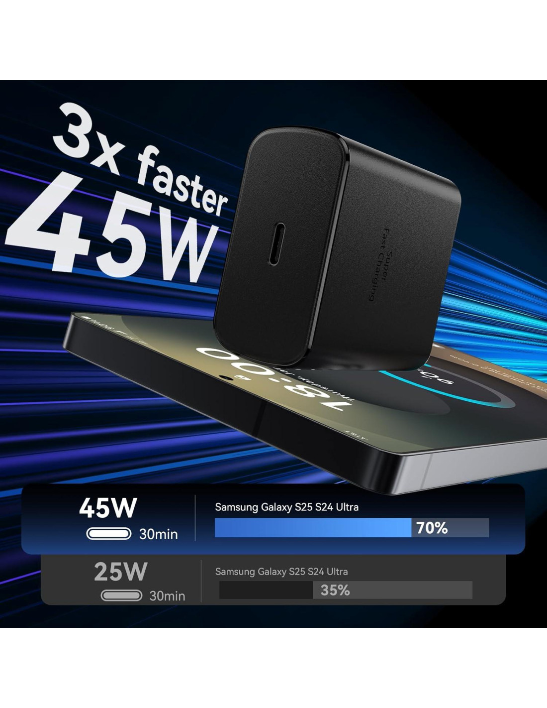 Este cargador super rápido de 45W es compatible con el nuevo Samsung Galaxy S25 Ultra, cargando del 0% al 60% en solo 30 minutos, mucho más rápido que el cargador original.